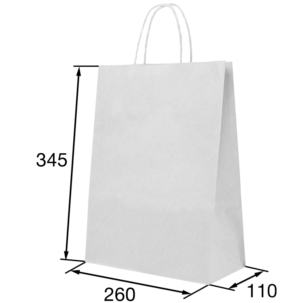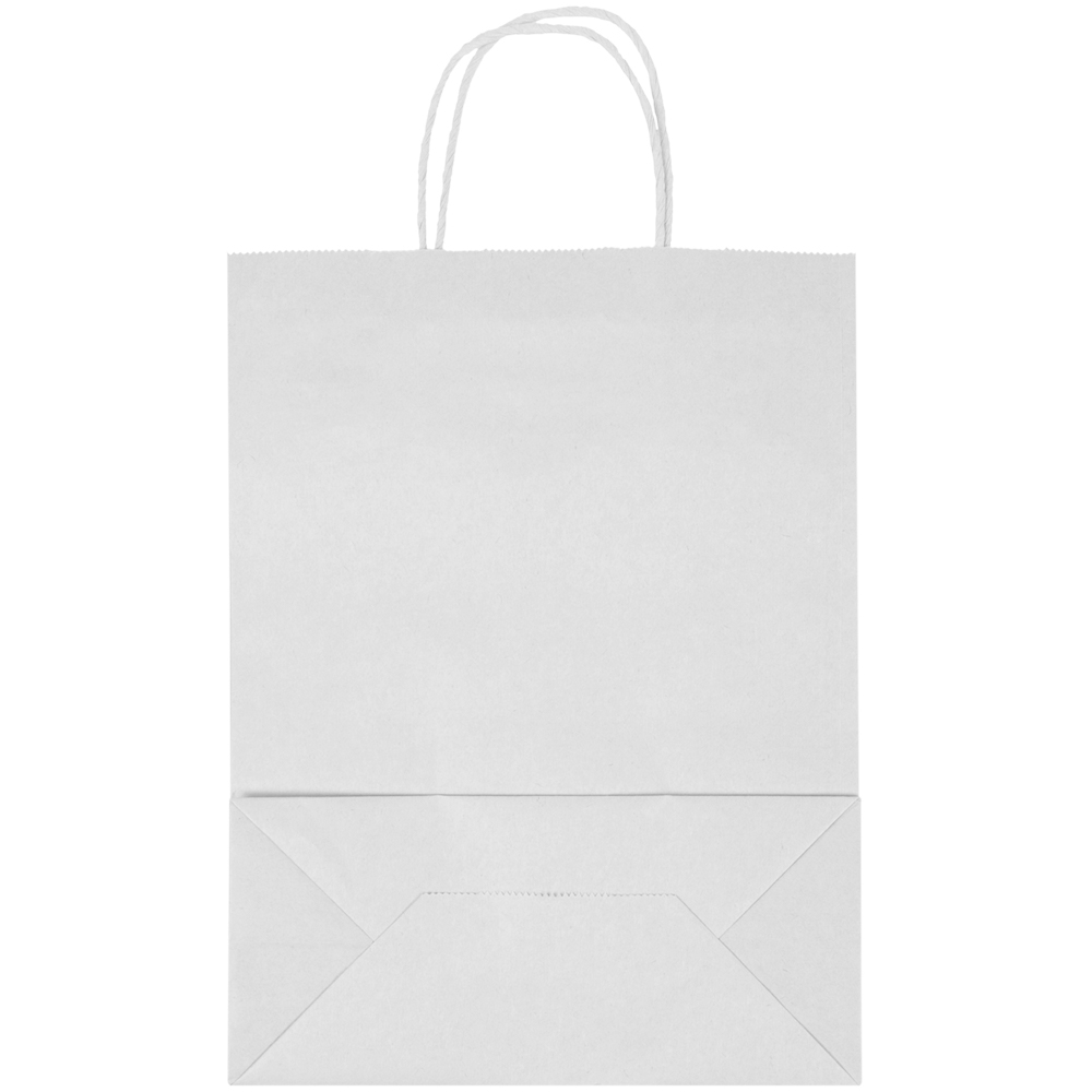 Бумажный белый крафт пакет с крученой ручкой шириной 110 мм, длиной 260 мм, высотой 345 мм изготовлен из экологичного материала. Пакеты производятся в России.