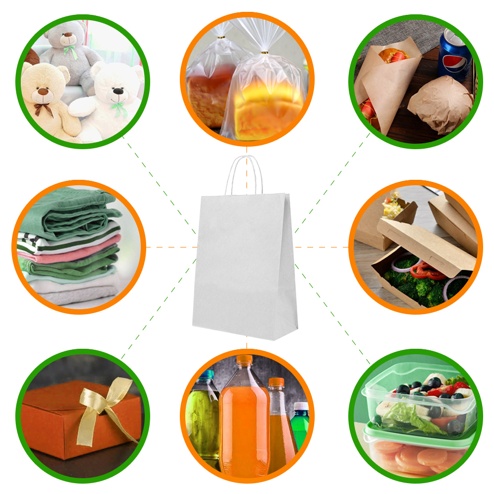 Белые пакеты с крученой ручкой используются для упаковки, переноски, хранения продуктов питания и бытовых товаров. Они незаменимы в магазинах, пекарнях, кафе, ресторанах и на фудкортах.