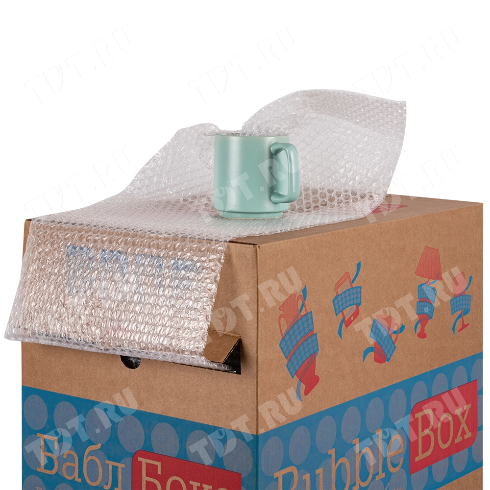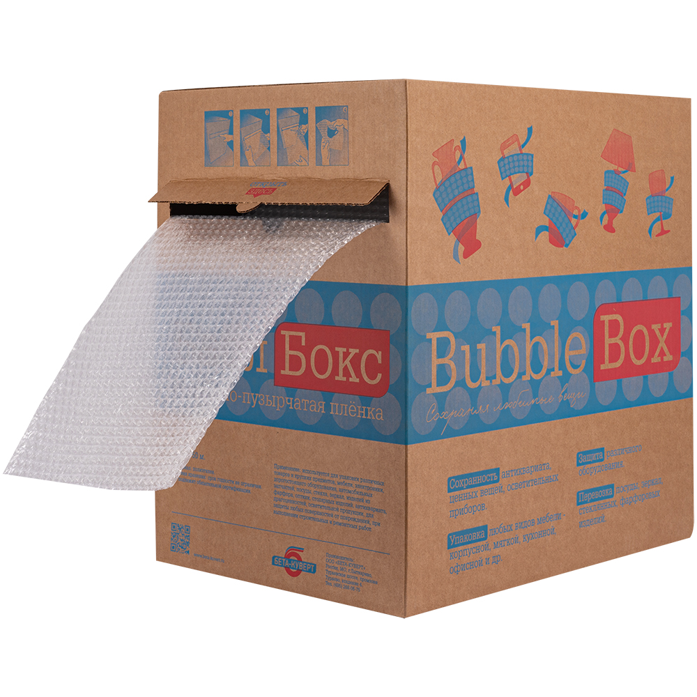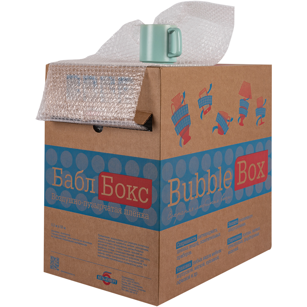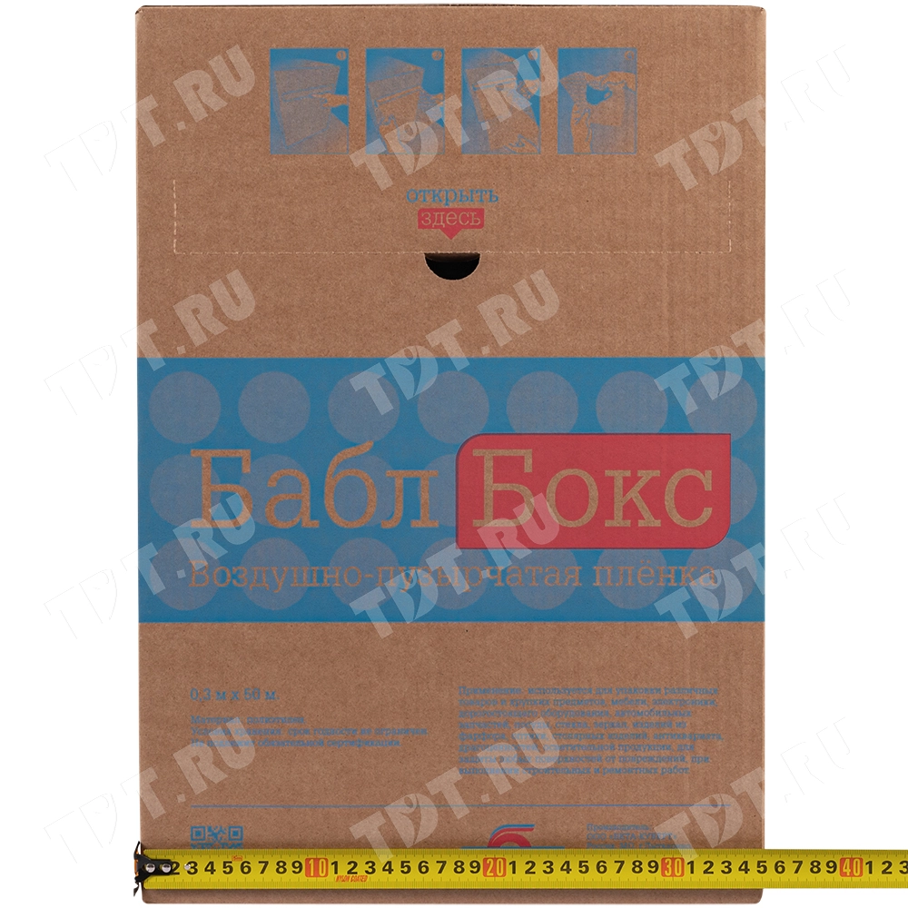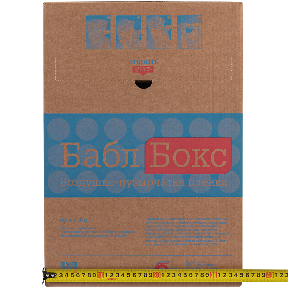 Прозрачная трехслойная воздушно-пузырчатая пленка в коробке «БаблБокс», намоткой 50 м, шириной рулона 0.3 м, диаметром пузырька 10 мм, плотностью 60 г/м². Изготовлена из полиэтилена. Производится в России.