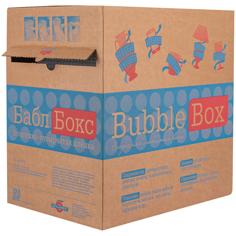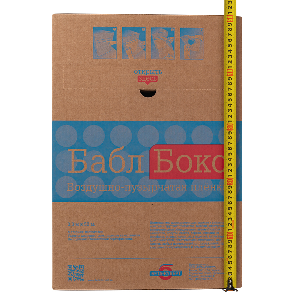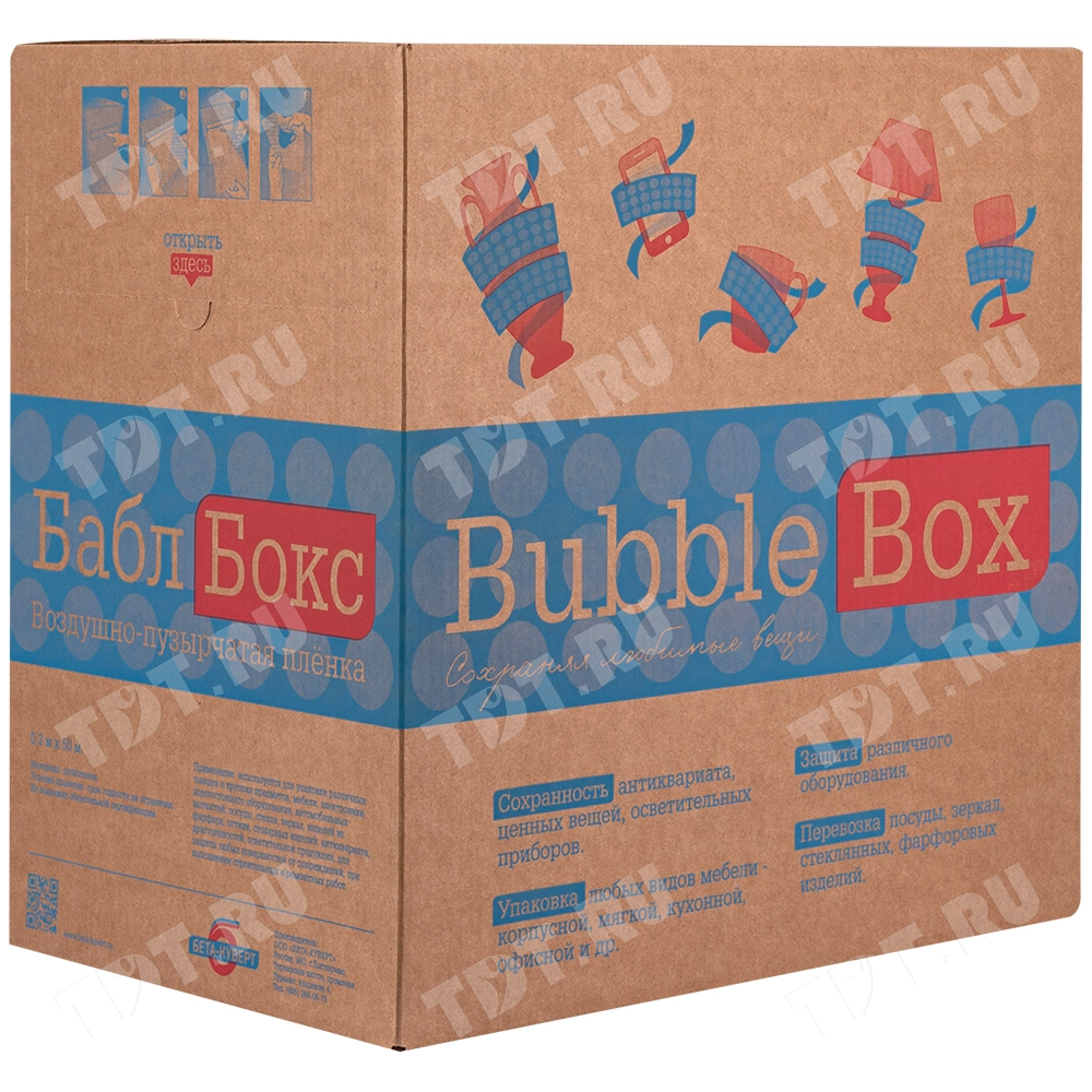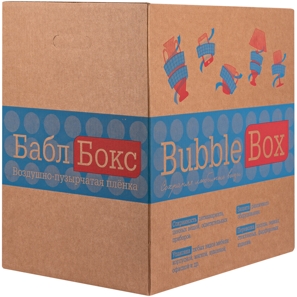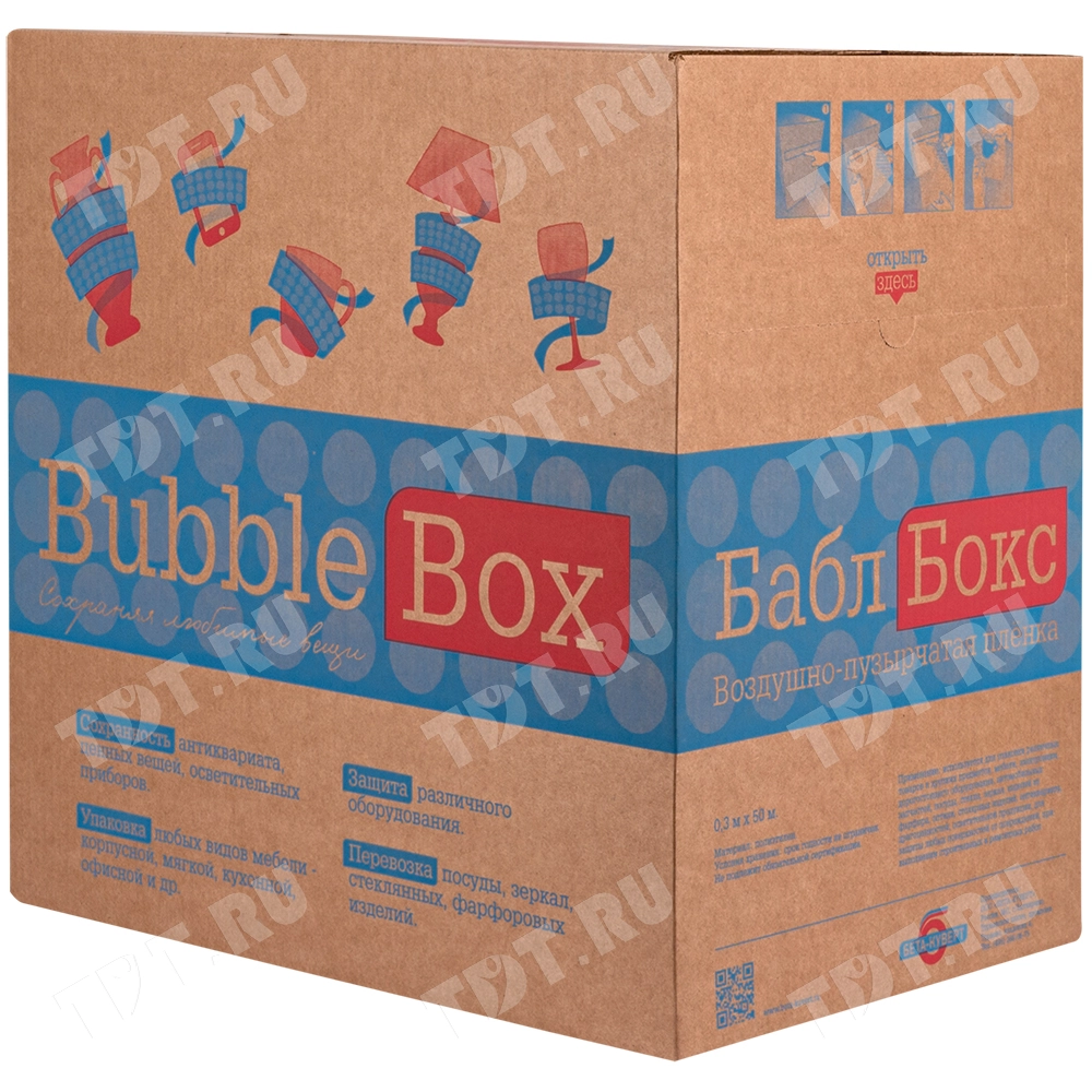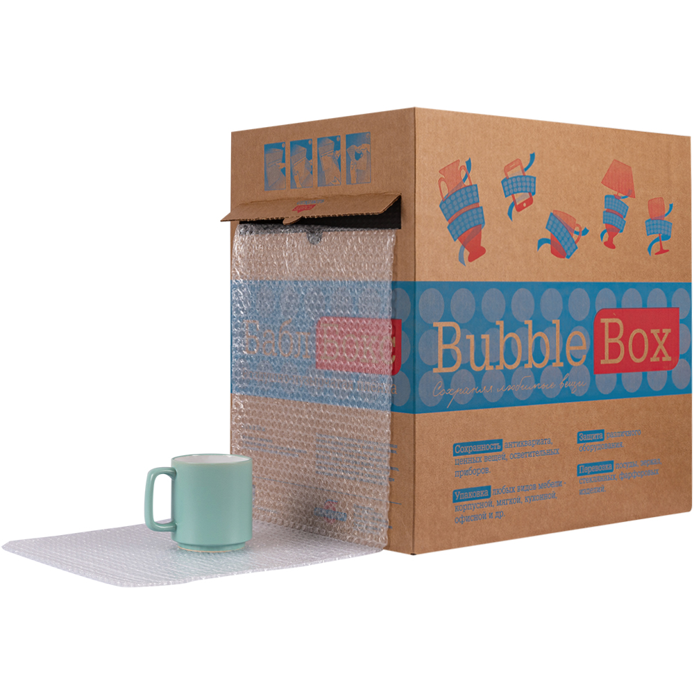 Прозрачная трехслойная воздушно-пузырчатая пленка в коробке «БаблБокс», намоткой 50 м, шириной рулона 0.3 м, диаметром пузырька 10 мм, плотностью 60 г/м². Изготовлена из полиэтилена. Производится в России.