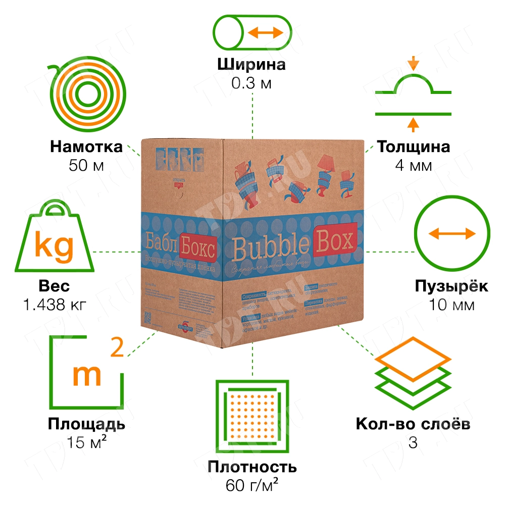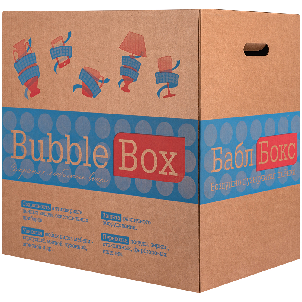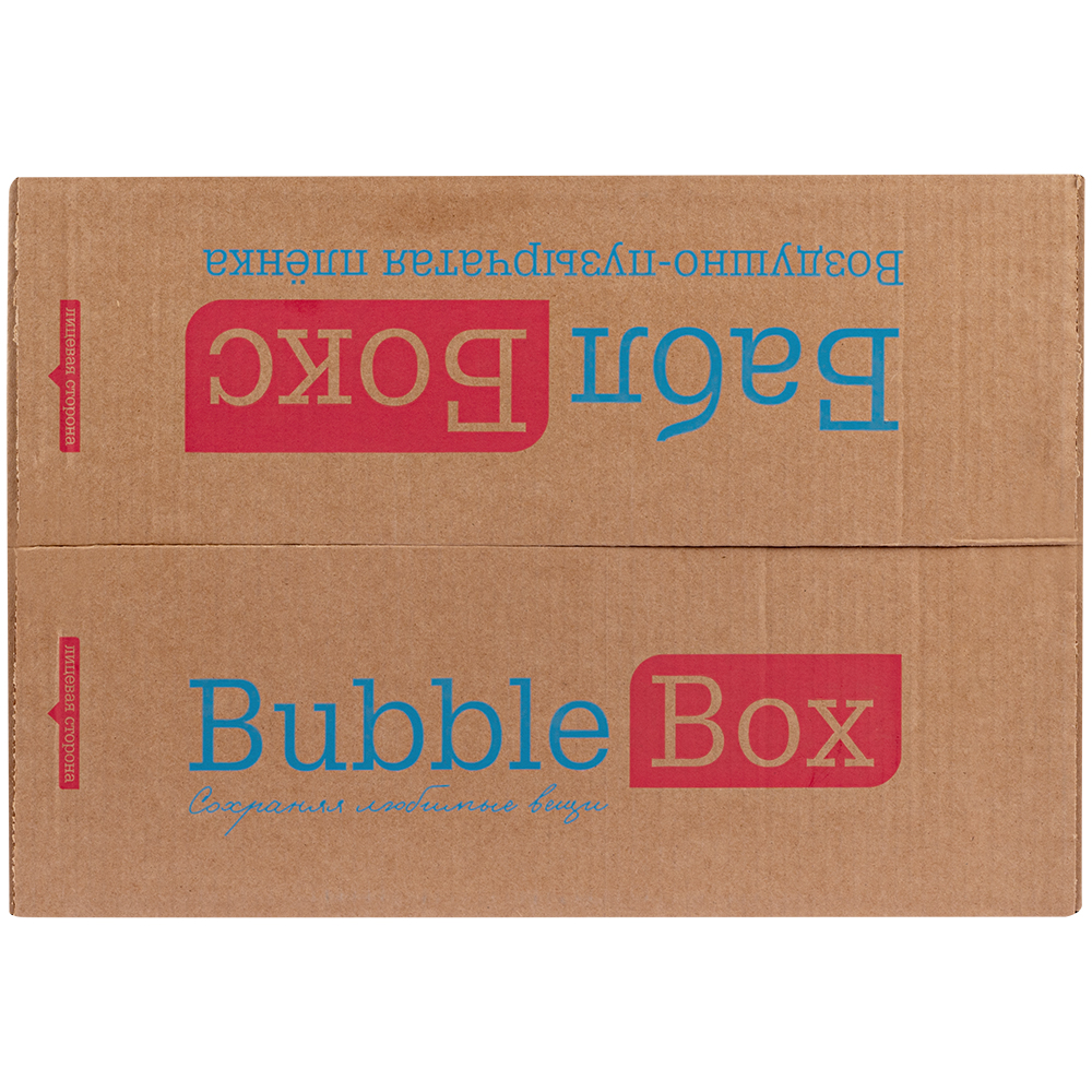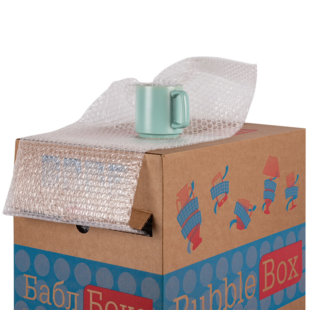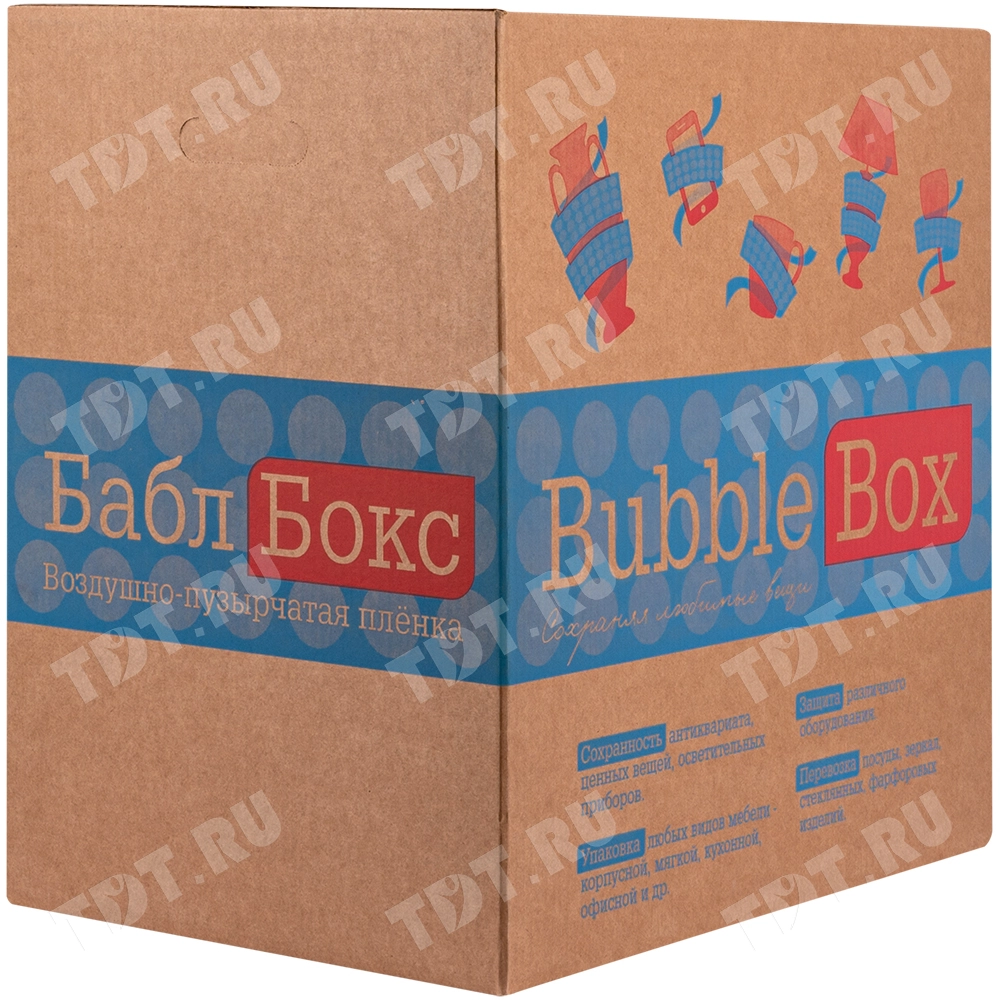 Прозрачная трехслойная воздушно-пузырчатая пленка в коробке «БаблБокс», намоткой 50 м, шириной рулона 0.3 м, диаметром пузырька 10 мм, плотностью 60 г/м². Изготовлена из полиэтилена. Производится в России.