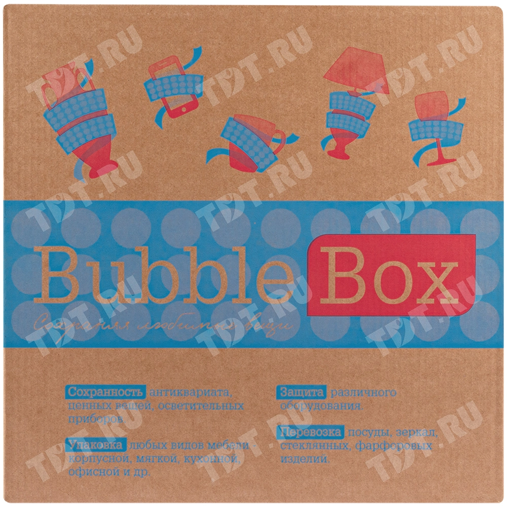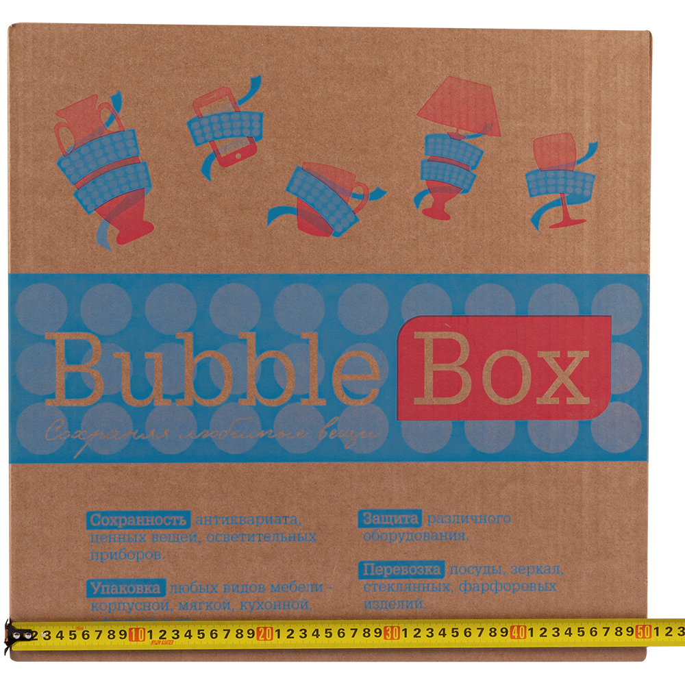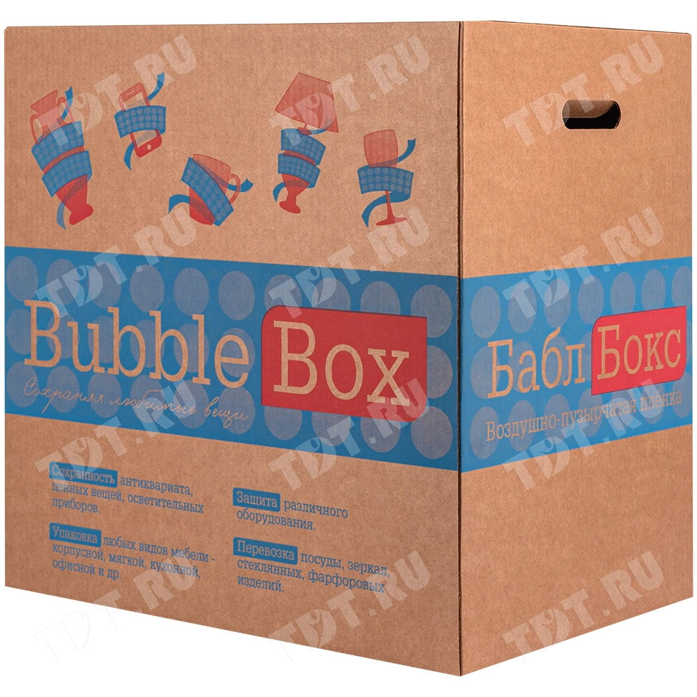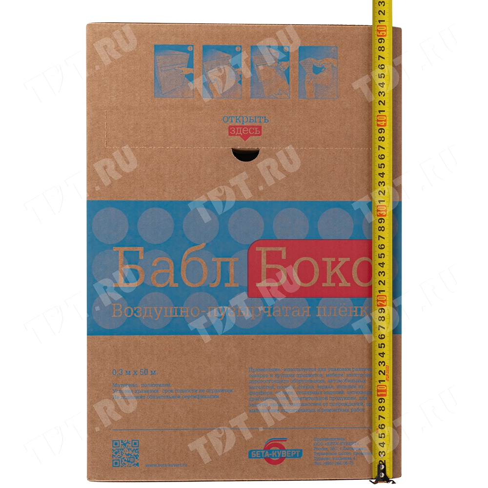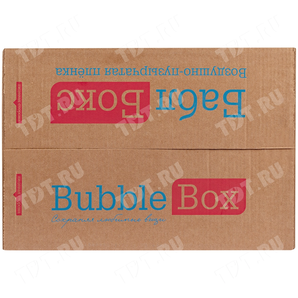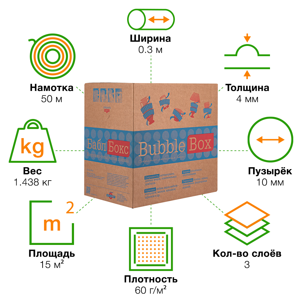 Прозрачная трехслойная воздушно-пузырчатая пленка в коробке «БаблБокс», намоткой 50 м, шириной рулона 0.3 м, диаметром пузырька 10 мм, плотностью 60 г/м². Изготовлена из полиэтилена. Производится в России.