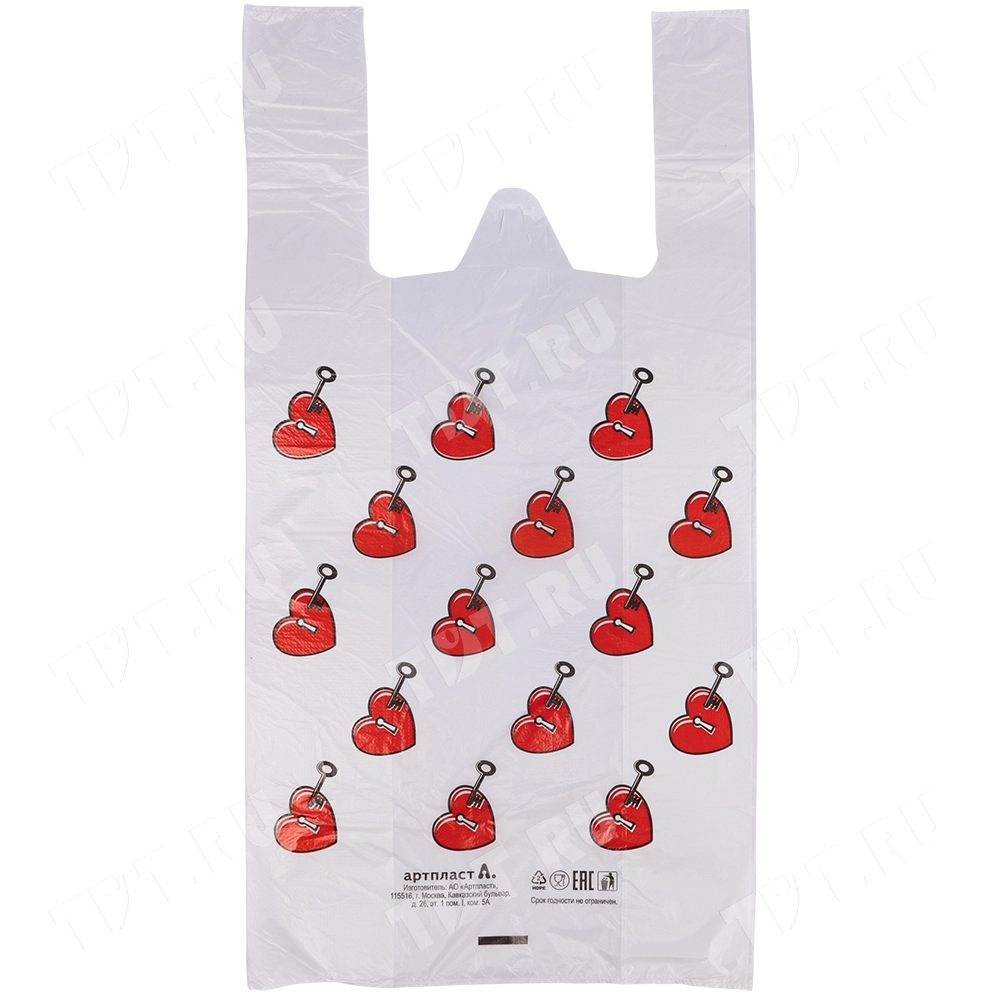 Полиэтиленовые пакеты майка ПНД «Сердечки», белого цвета, длиной 60 см, шириной 30+16 см, толщиной 15 мкм, в упаковке 50 штук. Материал – полиэтилен низкого давления. Производятся в России.