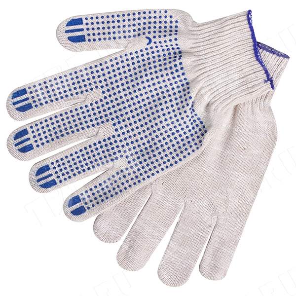 Рабочие хлопчатобумажные перчатки Люкс с точечным ПВХ покрытием синего цвета. Защищают руки от повреждений и загрязнений. Производятся в России.