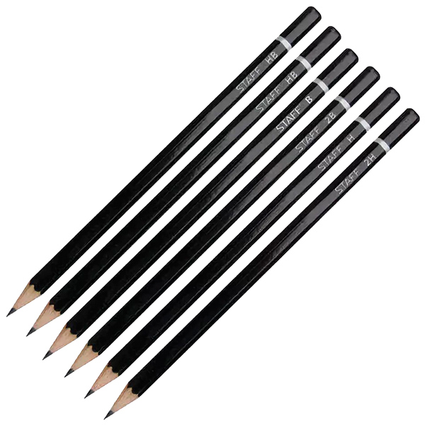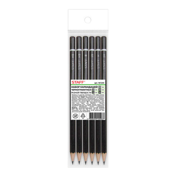 Карандаши в наборе имеют разные степени твёрдости - 2Н, Н, НВ, НВ, В, 2В.