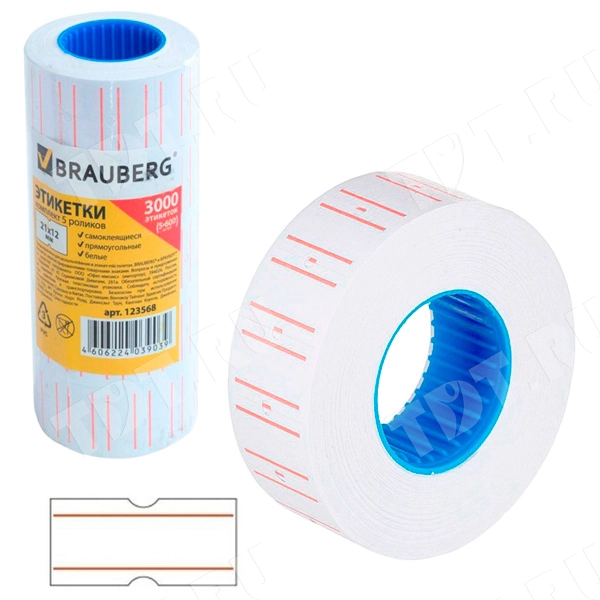 Самоклеящиеся этикетки BRAUBERG (комплект 5 роликов), в упаковке по 3000 штук (5*600), код производителя 123568, прямоугольные, белого цвета с красной полосой, диной этикетки 21 мм, шириной этикетки 12 мм, весом упаковки 270 г. Производятся в Китае.