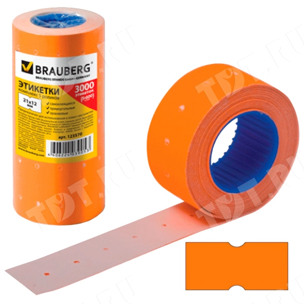 Самоклеящиеся этикетки BRAUBERG прямоугольные (комплект 5 роликов), в упаковке по 3000 штук (5*600), код производителя 123570, оранжевого цвета, диной этикетки 21 мм, шириной этикетки 12 мм, весом упаковки 270 г. Производятся в Китае.