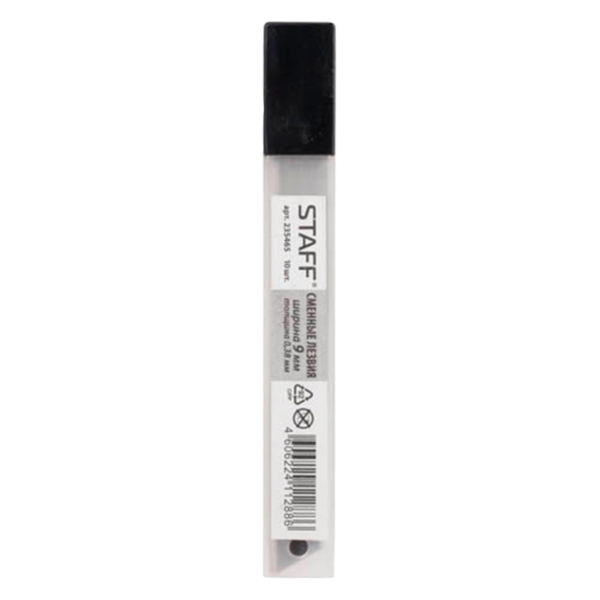 Набор сменных лезвий STAFF в пластиковом боксе, код производителя 235465, шириной 9 мм, толщиной 0.38 мм, в упаковке по 10 штук. Форма лезвия – параллелограмм. Материал лезвия – углеродистая сталь. Производятся в Китае.