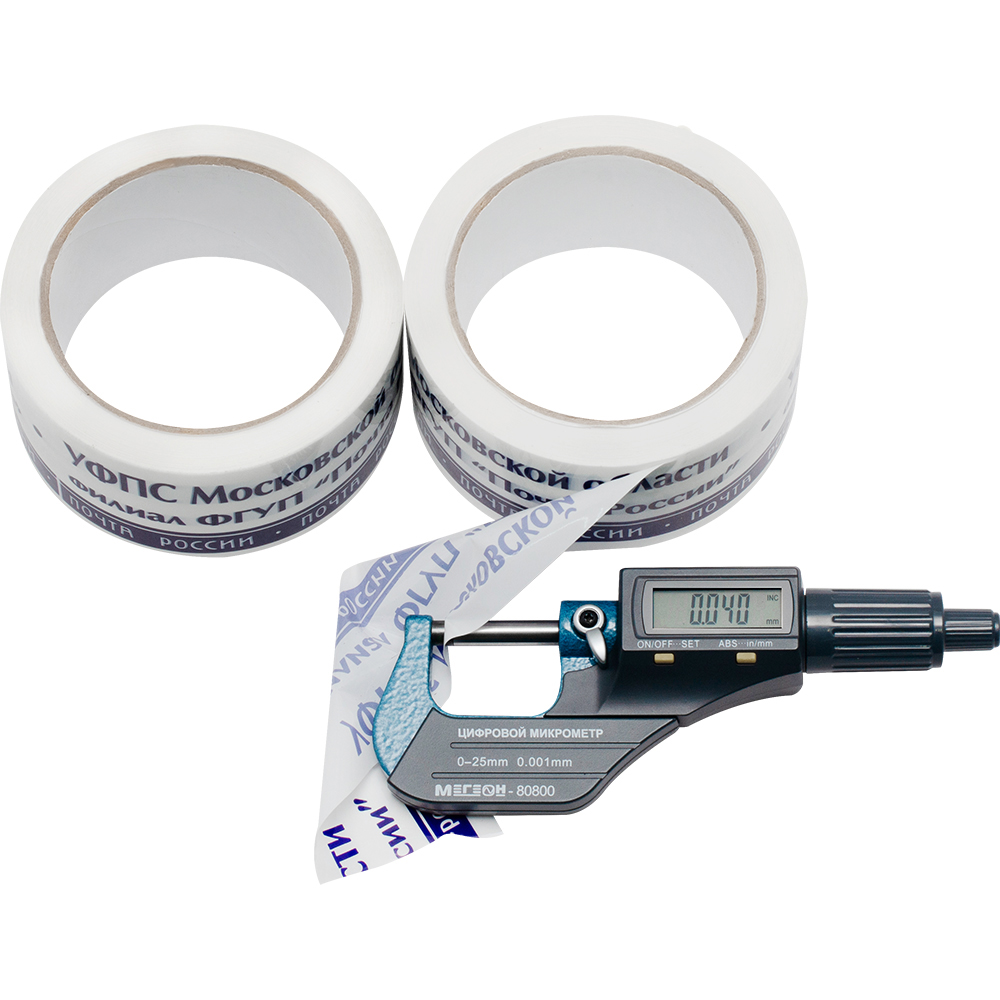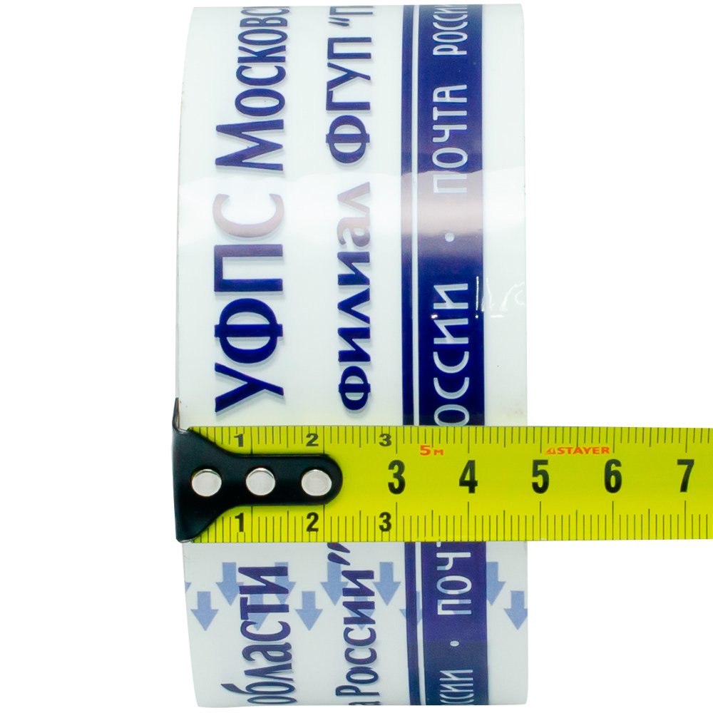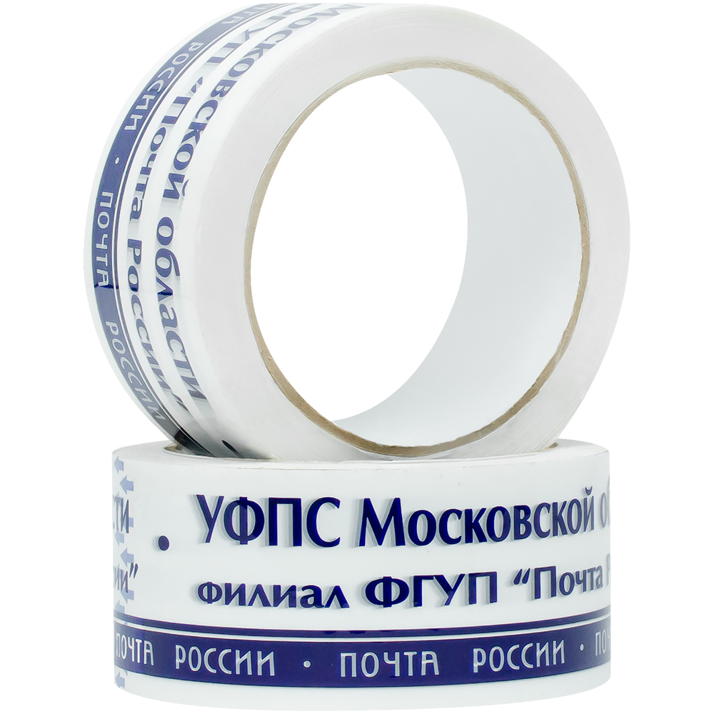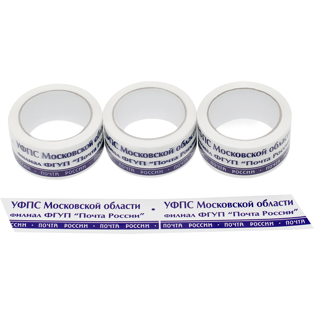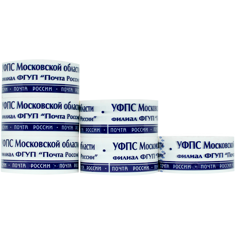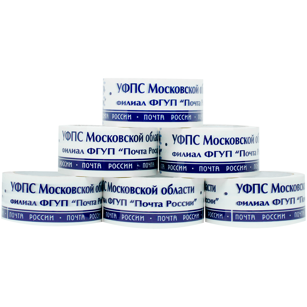 Клейкая лента с печатью УФПС Московская область Филиал ФГУП "Почта России" шириной 48 мм, диаметром втулки 76 мм, намоткой 51 метр. Изготовлена на основе полипропилена.