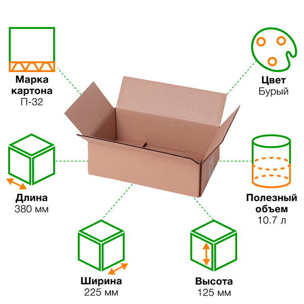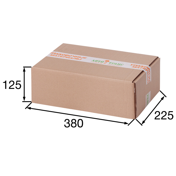 Короб пятислойный №25 бурого цвета, длиной 380 мм, шириной 225 мм и высотой 125 мм. Изготовлен из пятислойного картона марки П-32. Полезный объём — 10.7 л.