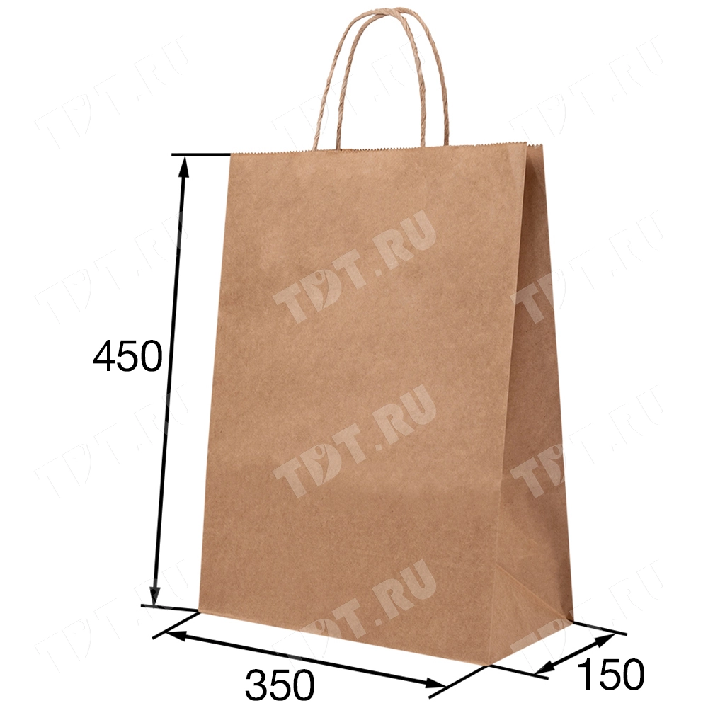 Бумажный крафт пакет с крученой ручкой шириной 150 мм, длиной 350 мм, высотой 450 мм изготовлен из экологичного материала. Пакеты производятся в России.