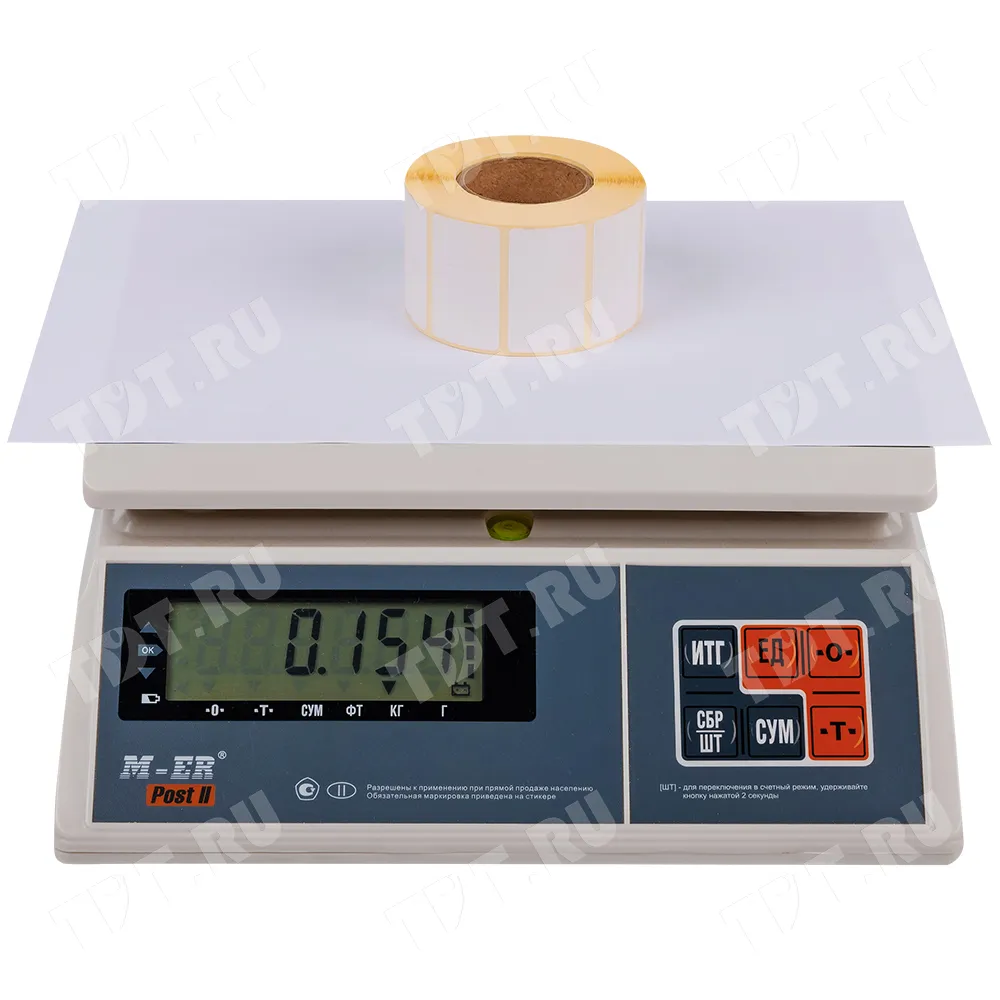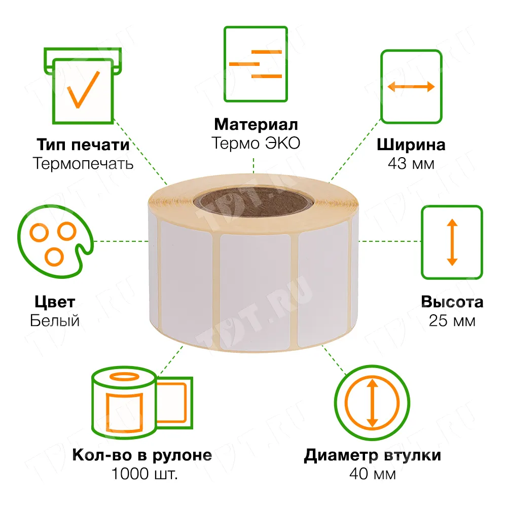 Самоклеящиеся этикетки ЭКО из матовой бумаги белого цвета, шириной 43 мм, высотой 25 мм, диаметром втулки 40 мм, количеством в рулоне по 1000 штук. Производятся в России. Термоэтикетки ЭКО в рулонах предназначены для печати на принтерах без риббона. На этикетках есть специальный слой, который при нагреве термоголовки принтера темнеет, за счет этого происходит печать.