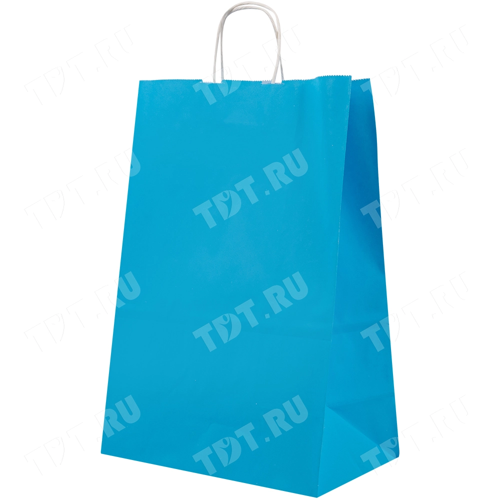 Голубой бумажный крафт пакет с крученой ручкой шириной 110 мм, длиной 250 мм, высотой 320 мм изготовлен из экологичного материала. Пакеты производятся в России.