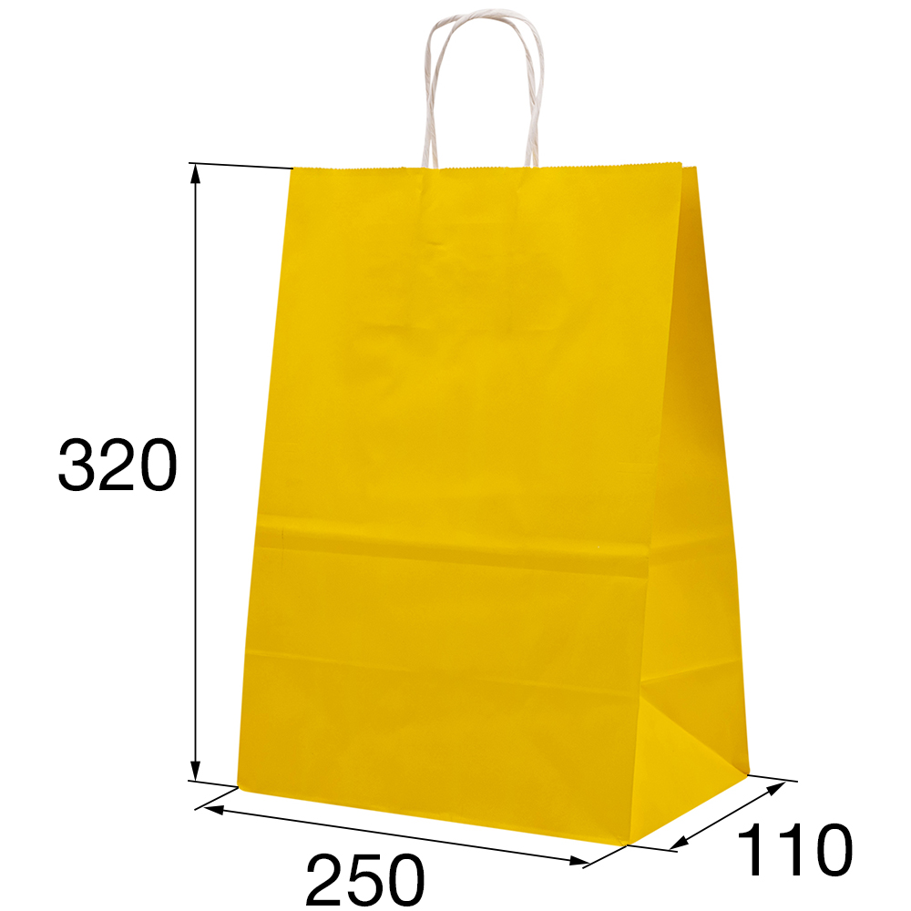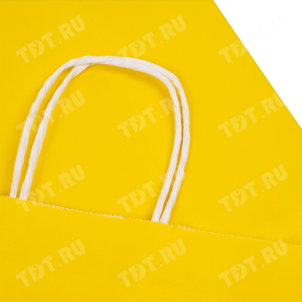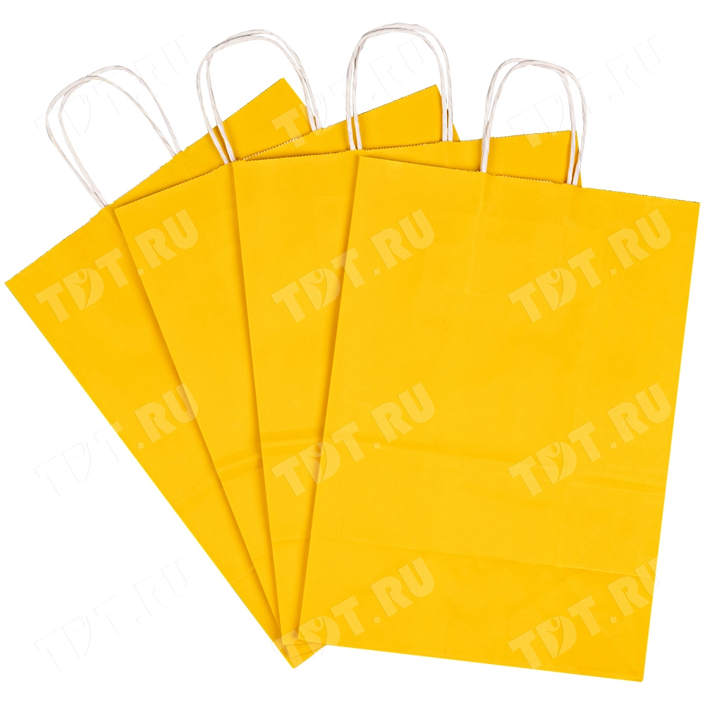 Жёлтый бумажный крафт пакет с крученой ручкой шириной 110 мм, длиной 250 мм, высотой 320 мм изготовлен из экологичного материала. Пакеты производятся в России.