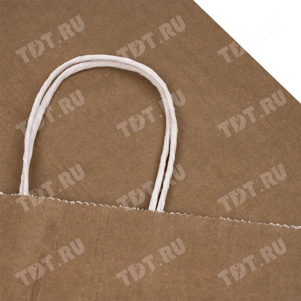 Ручки изготовлены в виде бумажного шпагата путем скручивания и надежным способом закреплены с внутренней стороны, что усиливает прочность, износостойкость и придает пакету эстетичный вид.
