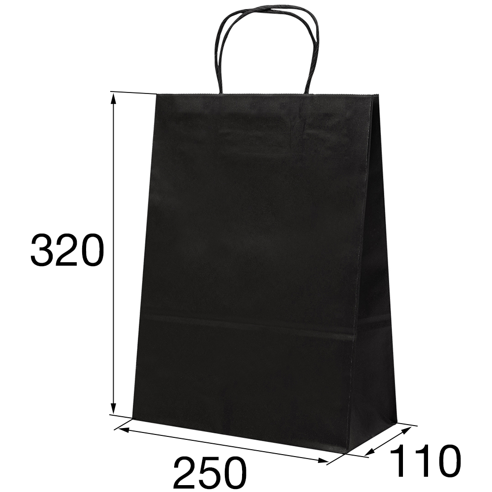 Чёрный бумажный крафт пакет с крученой ручкой шириной 110 мм, длиной 250 мм, высотой 320 мм изготовлен из экологичного материала. Пакеты производятся в России.