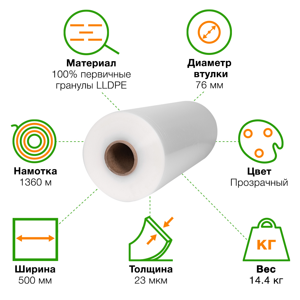 Прозрачная машинная стрейч пленка в рулоне, второго сорта, намоткой 1360 м, шириной 500 мм, толщиной 23 мкм. Изготовлена из линейного полиэтилена низкой плотности (ЛПЭНП). Производится в России.