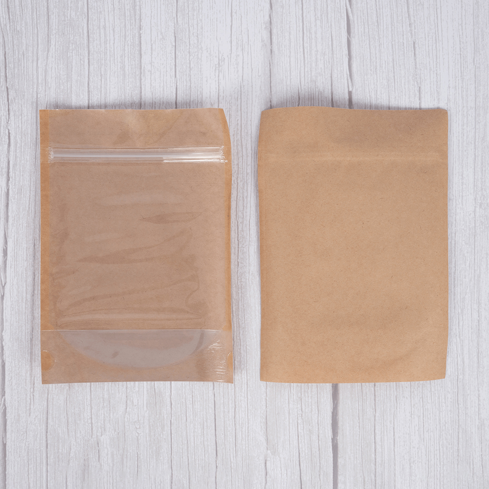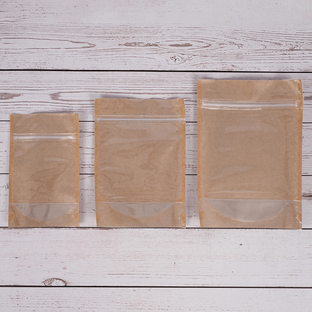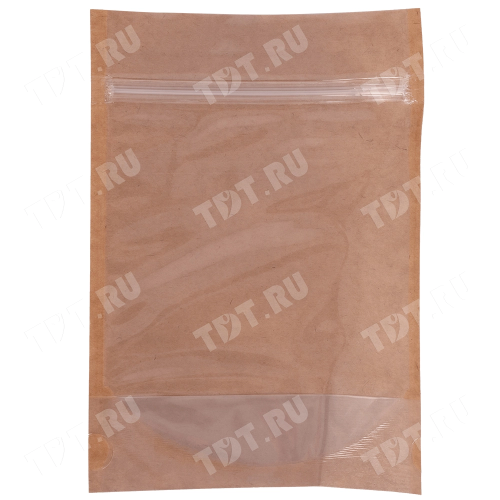 Крафт дой-пак с zip lock и окошком, шириной 150 мм, длиной 170 мм, расширением 40 мм. Пакеты производятся в России.