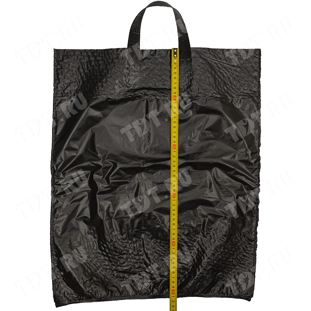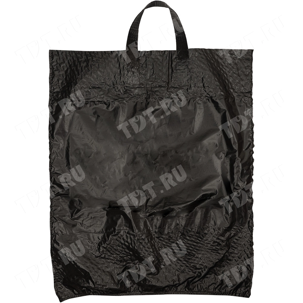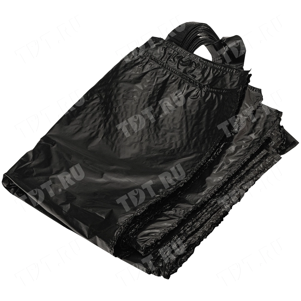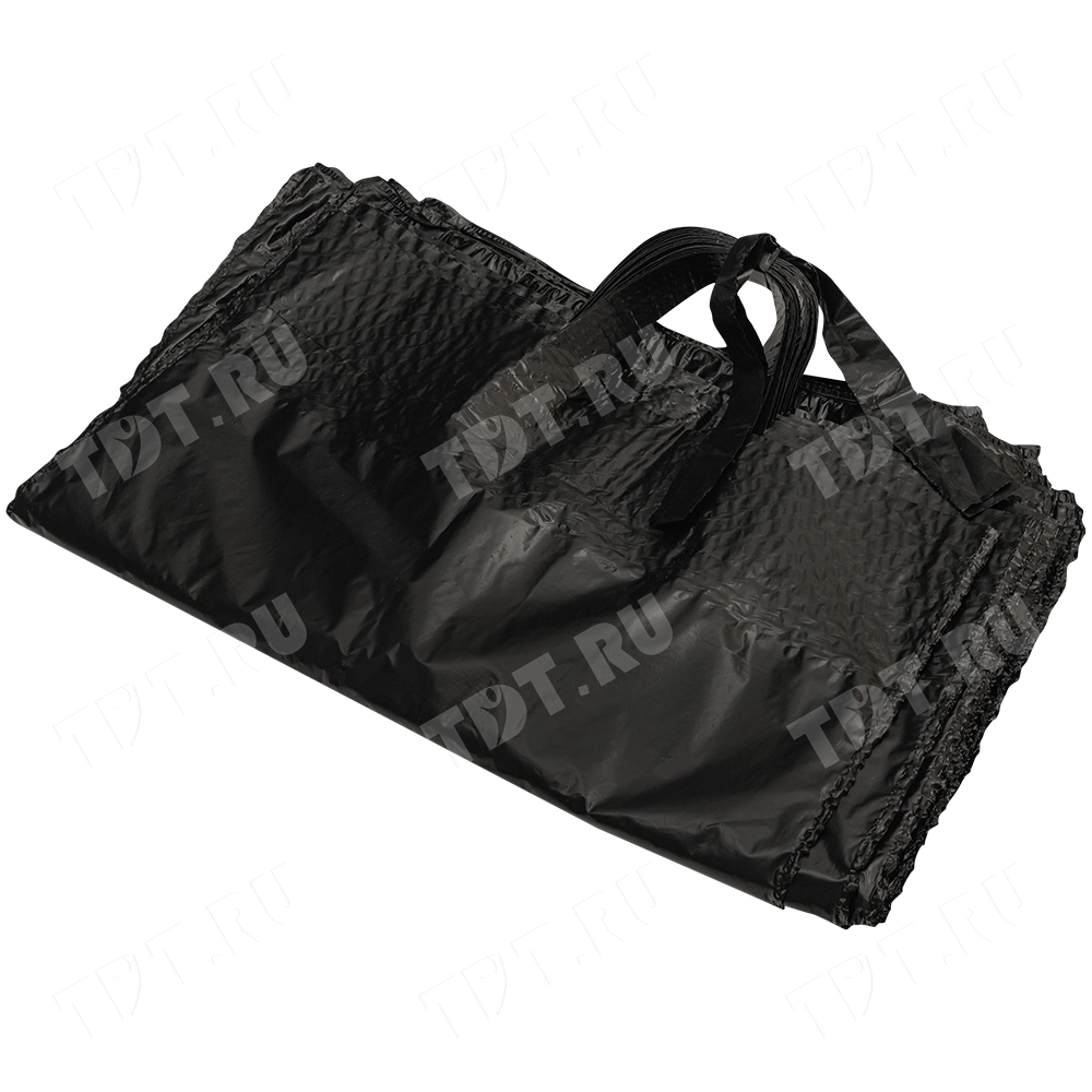 Чёрные полиэтиленовые пакеты ПВД с петлевой ручкой («Орловская» сумка), длиной 50 см, шириной 45 см, толщиной 80 мкм, в упаковке 10 штук. Материал – полиэтилен высокого давления. Производятся в России.