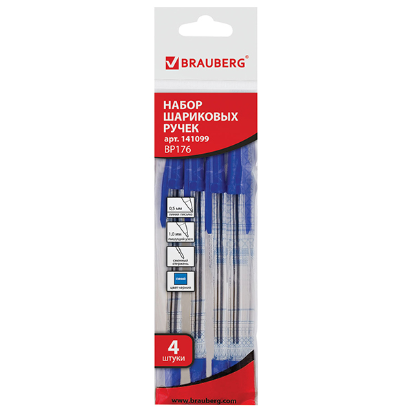 Набор шариковых ручек BRAUBERG Line синего цвета, в упаковке по 4 штуки, код производителя 141099. Производятся в Китае.