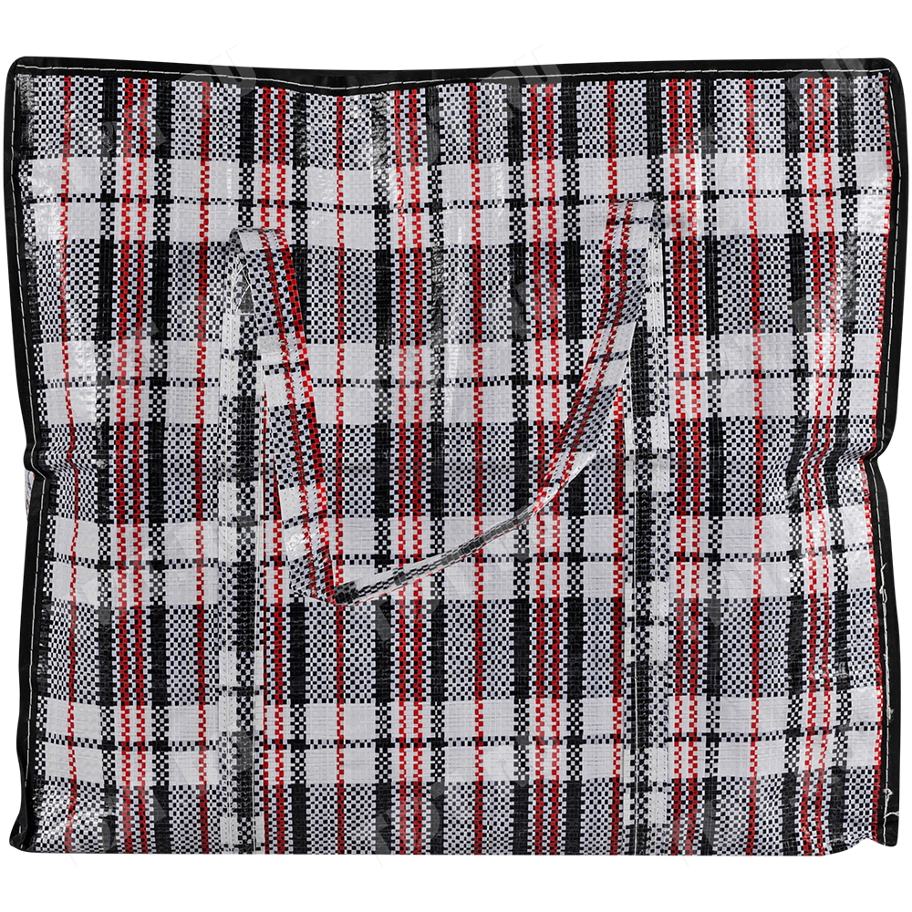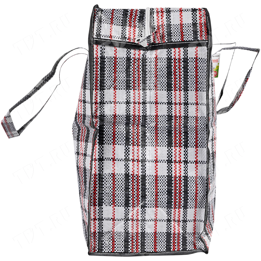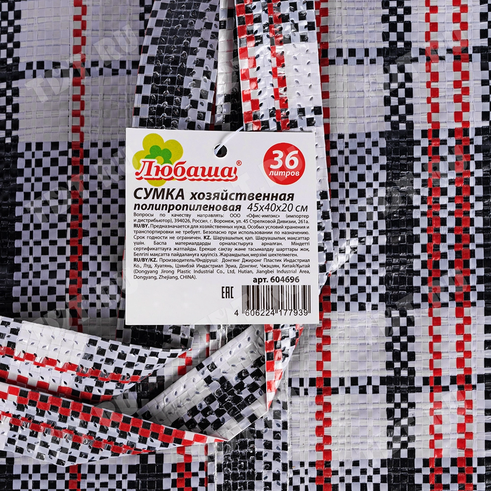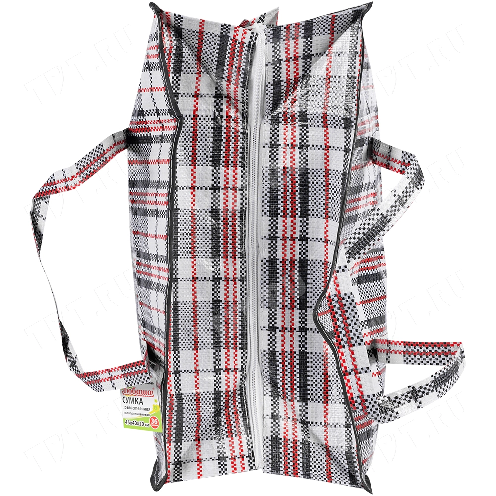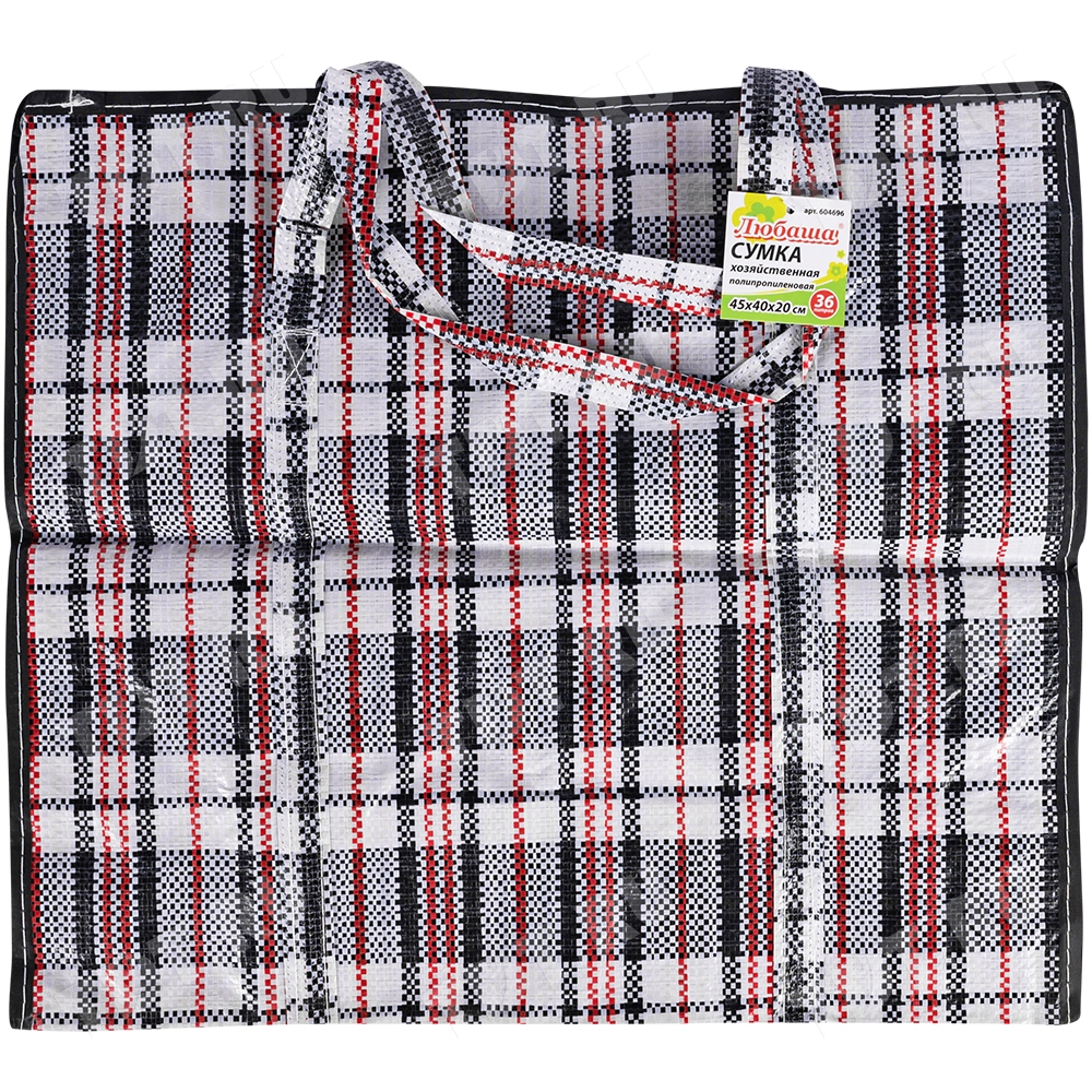Сумка-баул однослойная хозяйственная длиной 45 см, шириной 20 см, высотой 40 см, объемом 36 л, чёрно-красная. Материал полипропилен. Имеет прострочку по периметру. Занимает мало места в сложенном виде. Производится в Китае.