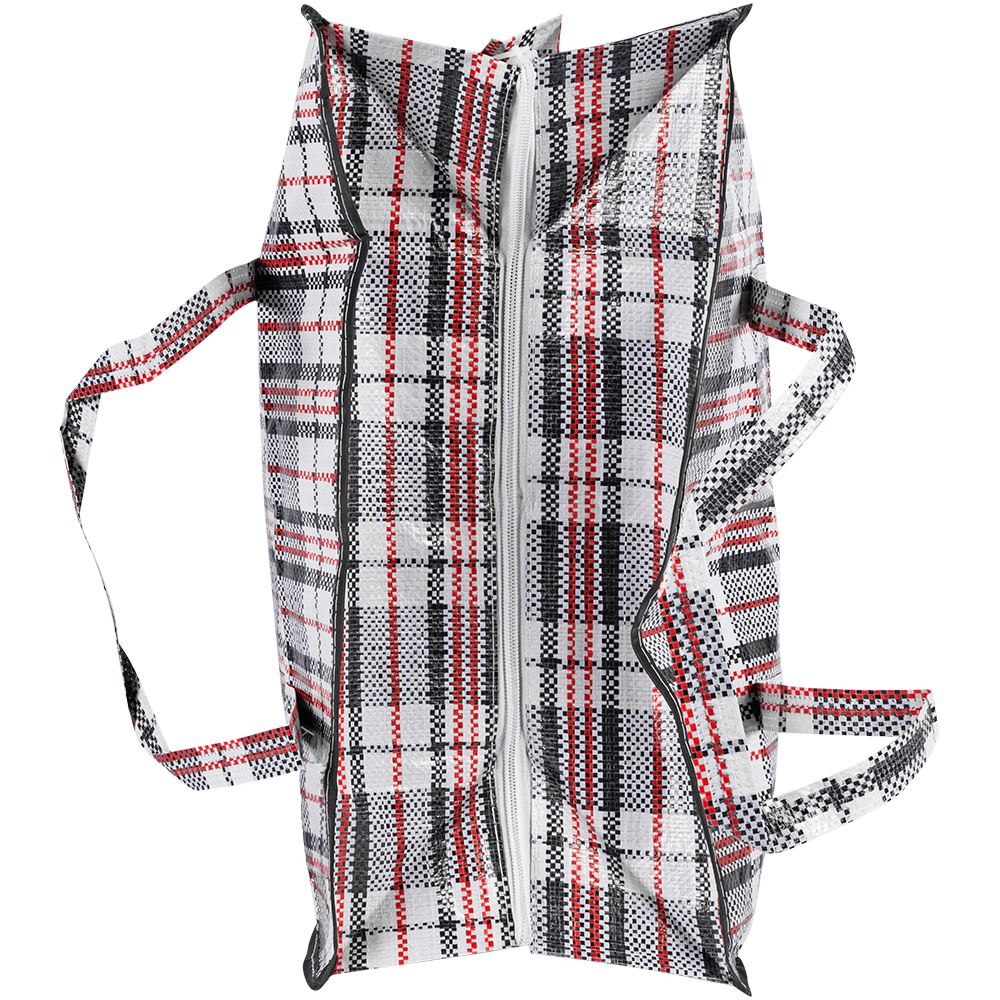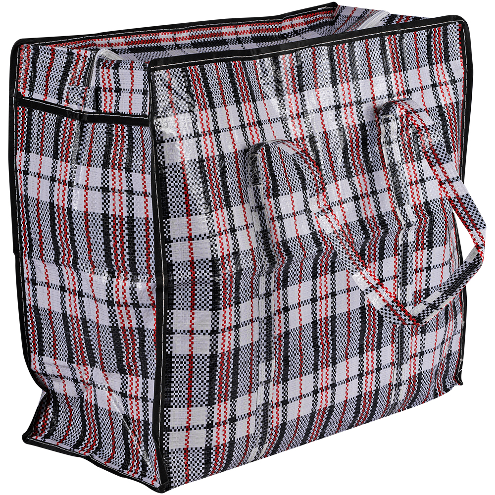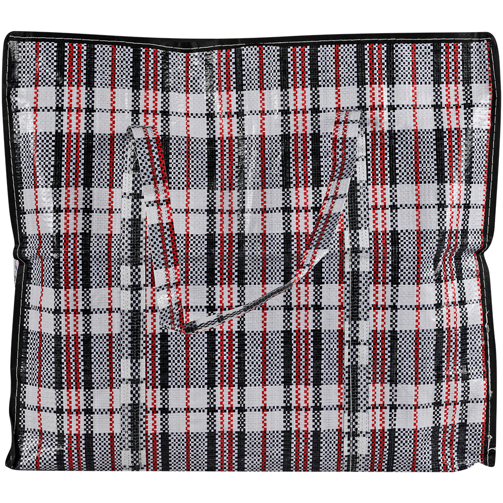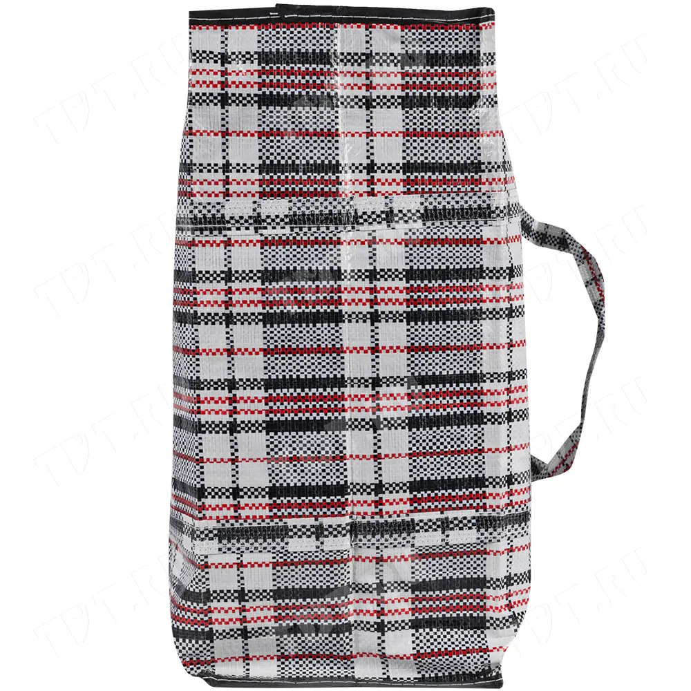 Большая сумка однослойная хозяйственная длиной 70 см, шириной 30 см, высотой 50 см, объемом 105 л, чёрно-красная. Материал полипропилен. Имеет прострочку по периметру. Занимает мало места в сложенном виде. Производится в Китае.