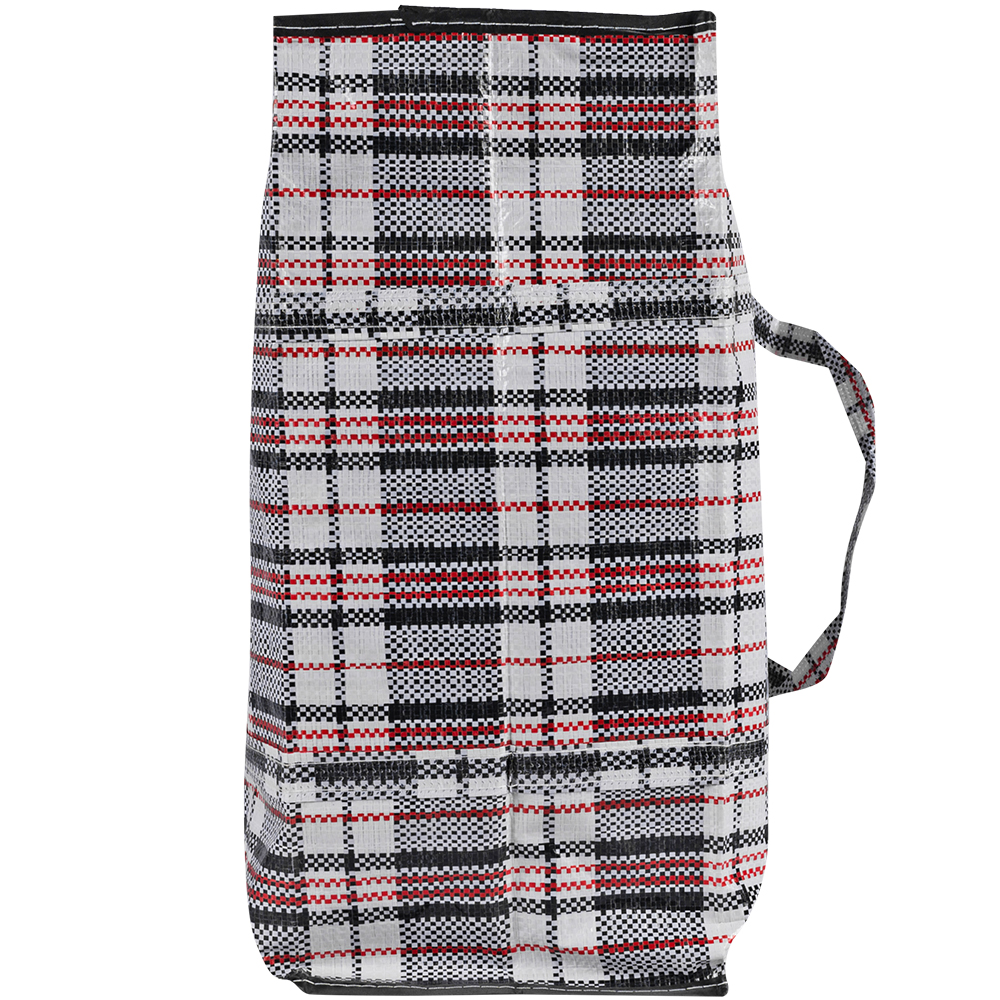 Огромная сумка однослойная хозяйственная длиной 80 см, шириной 35 см, высотой 60 см, объемом 168 л, чёрно-красная. Материал полипропилен. Имеет прострочку по периметру. Занимает мало места в сложенном виде. Производится в Китае.