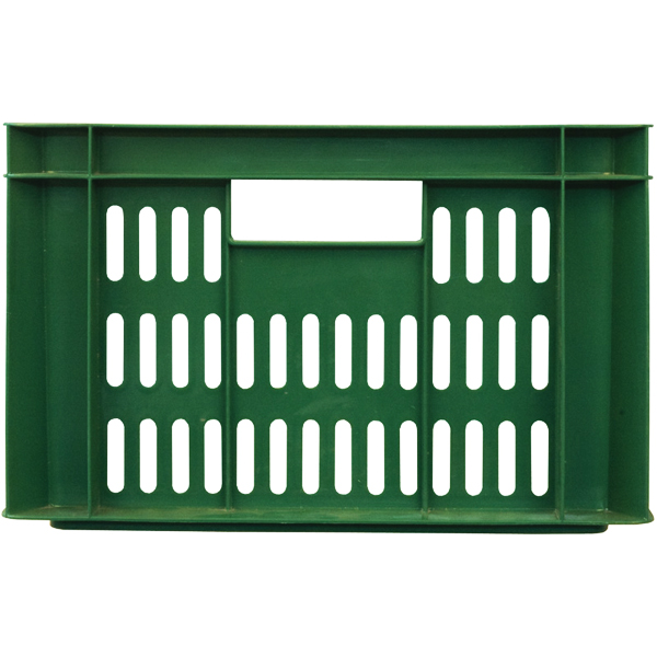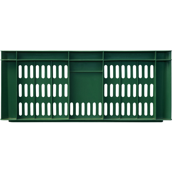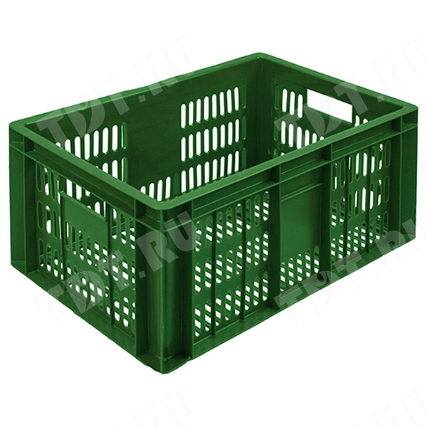 Пластиковый ящик зеленого цвета с двумя ручками для хранения и транспортировки колбасной и мясной продукции, овощей, фруктов длиной 600 мм, шириной 400 мм, высотой 250 мм. Кратны размерам пластиковых поддонов: 800*600 мм, 1200*800 мм, 1200*1000 мм. Изготовлен из полиэтилена. Производится в России.