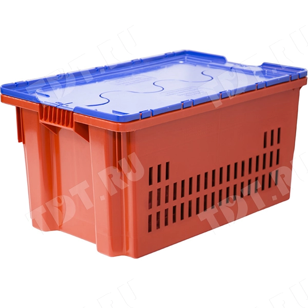Красный пластиковый ящик с перфорацией и синей крышкой для хранения и транспортировки вещей длиной 600 мм, шириной 400 мм, высотой 350 мм. Изготовлен из полиэтилена. Производится в России.