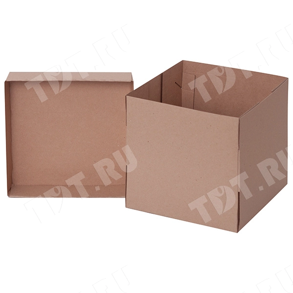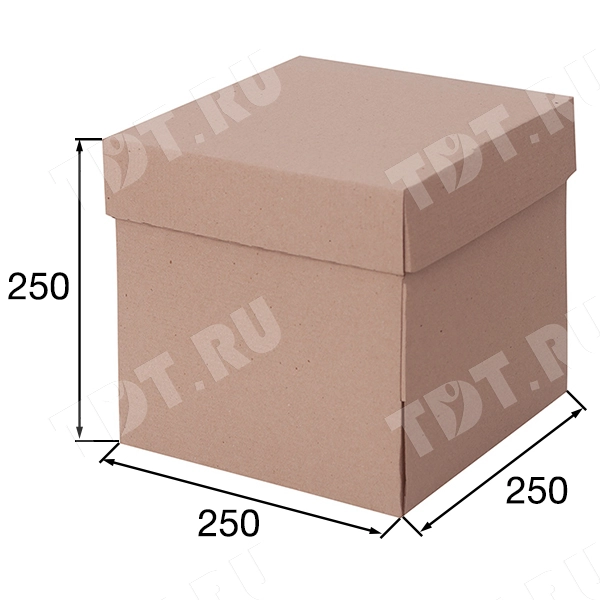 Коробка крышка-дно «Кубик» бурого цвета, серия КС-600, длиной 250 мм, шириной 250 мм и высотой 250 мм. Изготовлена из микрогофрокартона Т-23 Е. Полезный объём — 15.6 л.