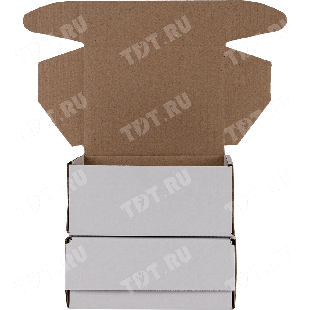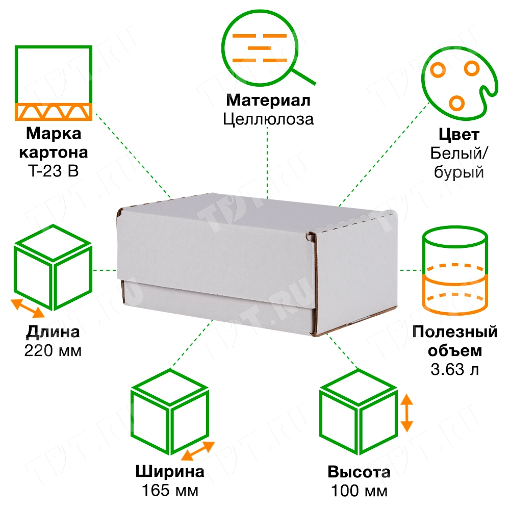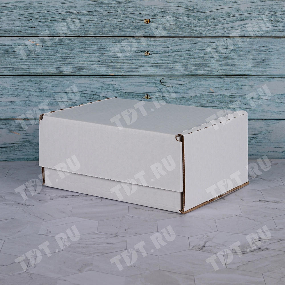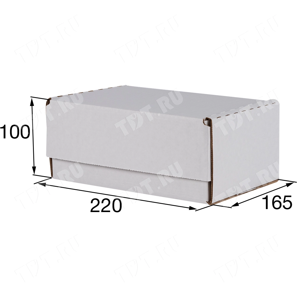 Почтовый короб тип «Д» белёный, длиной 220 мм, шириной 165 мм и высотой 100 мм. Изготовлен из трёхслойного гофрокартона Т-23 В. Полезный объём — 3.63 л.