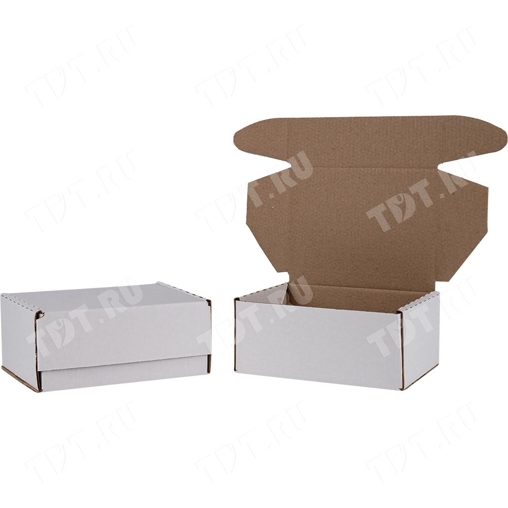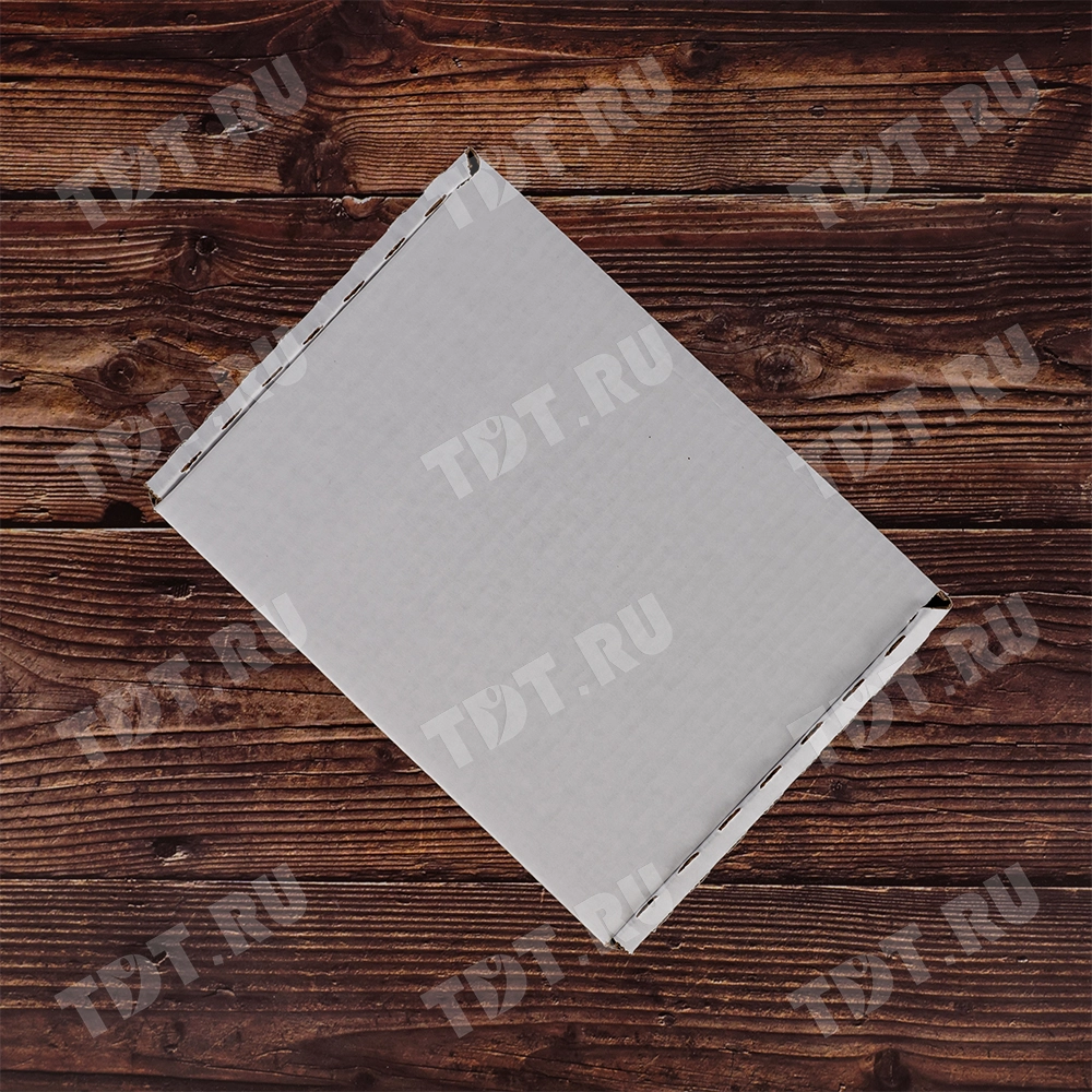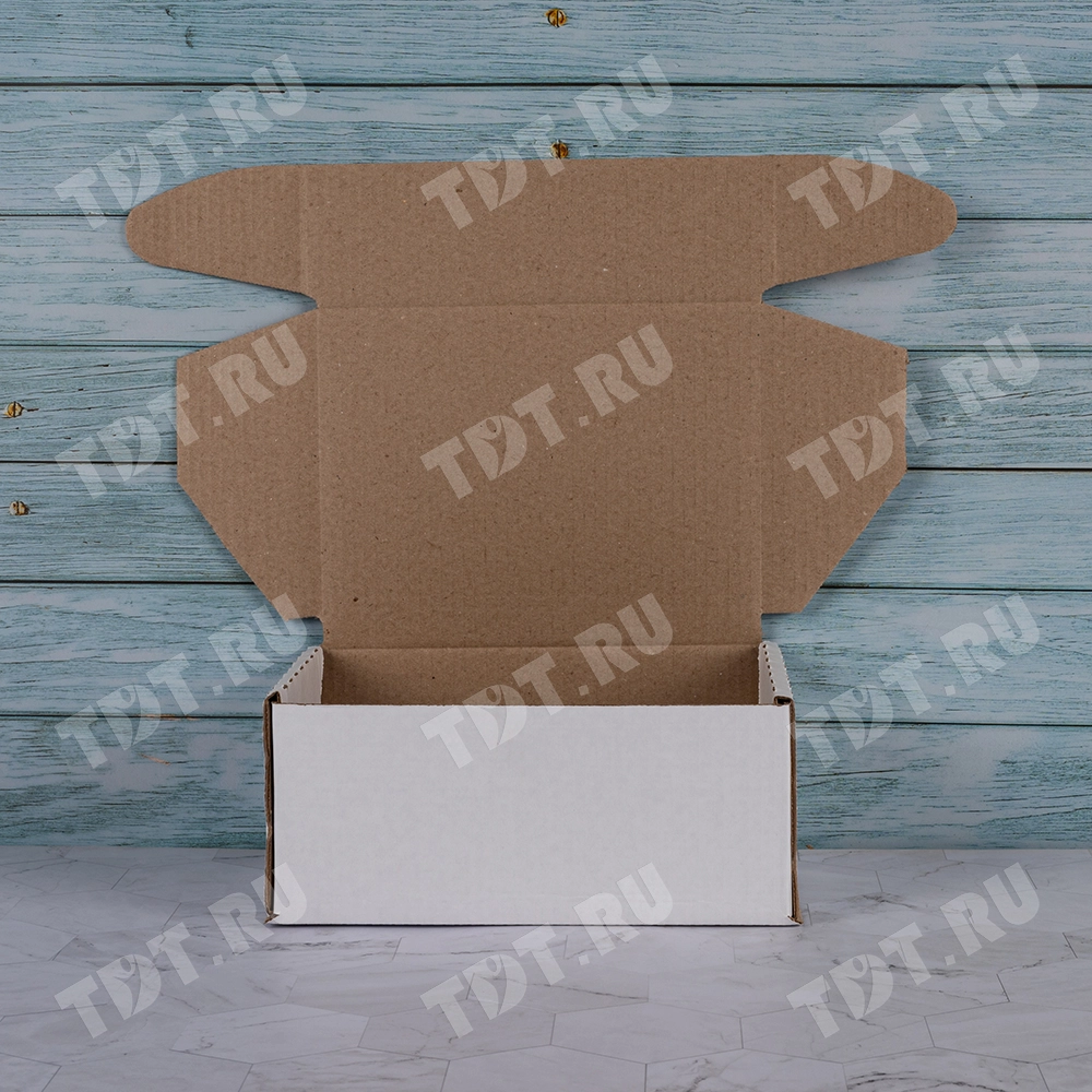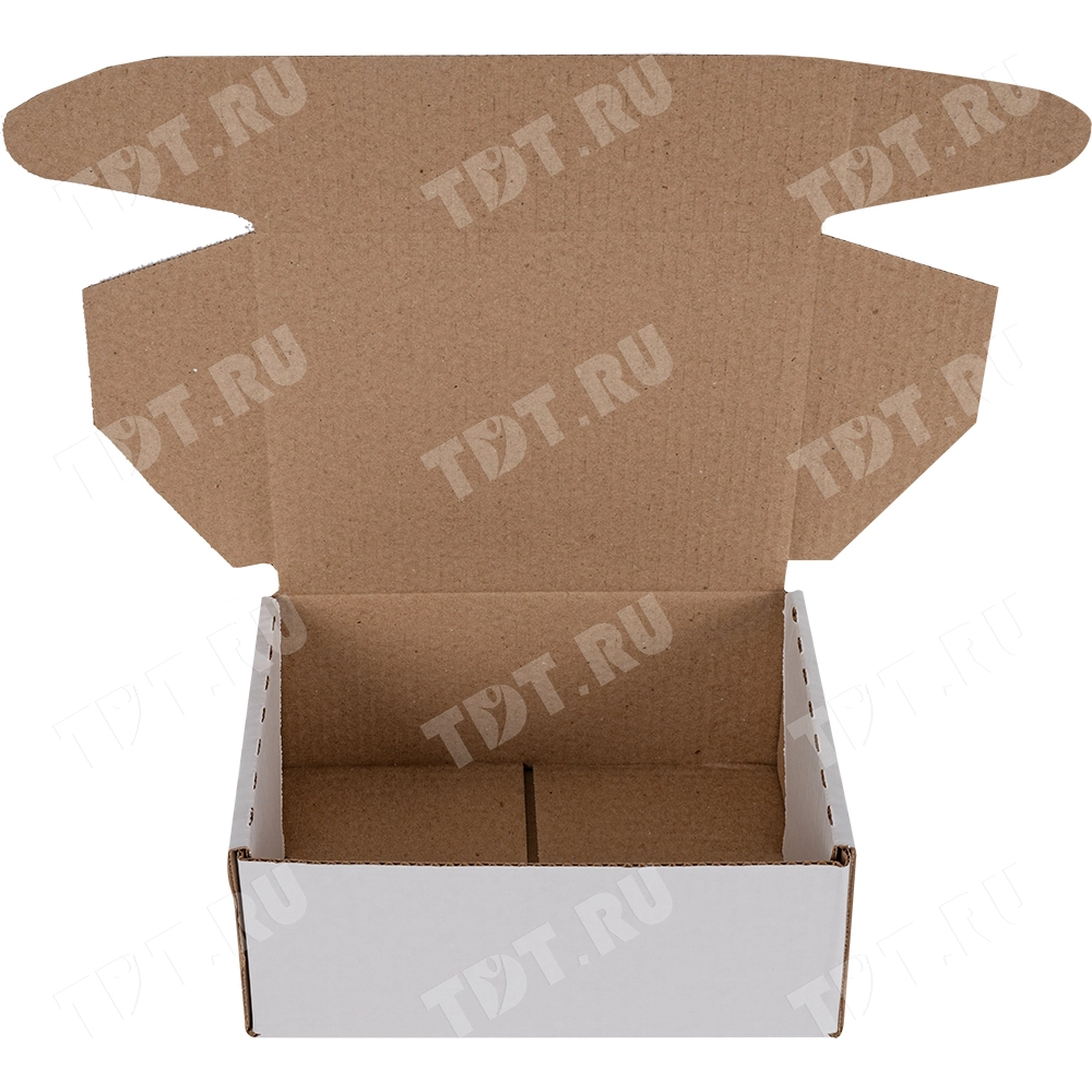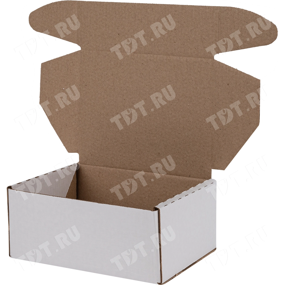 Почтовый короб тип «Д» белёный, длиной 220 мм, шириной 165 мм и высотой 100 мм. Изготовлен из трёхслойного гофрокартона Т-23 В. Полезный объём — 3.63 л.