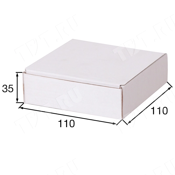 Короб КС-403 МГФ, серии КС-400, белый, длиной 110 мм, шириной 110 мм и высотой 35 мм. Изготовлен из микрогофрокартона Т-23. Полезный объём — 0.4 л.