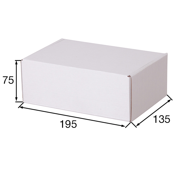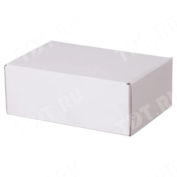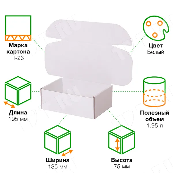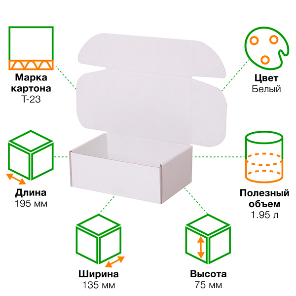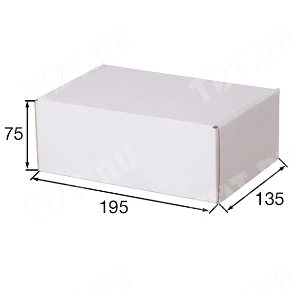 Короб КС-405 МГФ, серии КС-400, белый, длиной 195 мм, шириной 135 мм и высотой 75 мм. Изготовлен из микрогофрокартона Т-23. Полезный объём — 1.95 л.