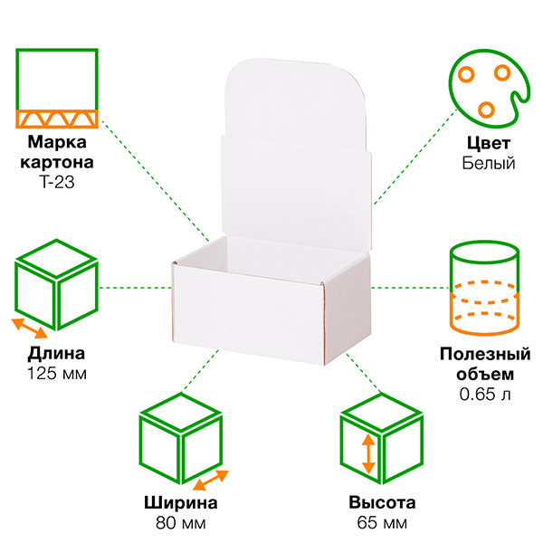 Короб КС-406 МГФ, серии КС-400, белый, длиной 125 мм, шириной 80 мм и высотой 65 мм. Изготовлен из микрогофрокартона Т-23. Полезный объём — 0.65 л.