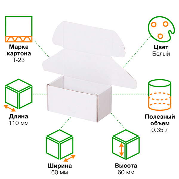 Короб КС-414 МГФ, серии КС-400, белый, длиной 110 мм, шириной 60 мм и высотой 60 мм. Изготовлен из микрогофрокартона Т-23. Полезный объём — 0.35 л.