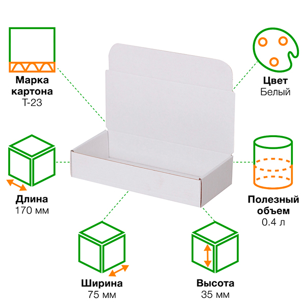 Короб КС-415 МГФ, серии КС-400, белый, длиной 170 мм, шириной 75 мм и высотой 35 мм. Изготовлен из микрогофрокартона Т-23. Полезный объём — 0.4 л.