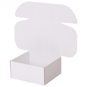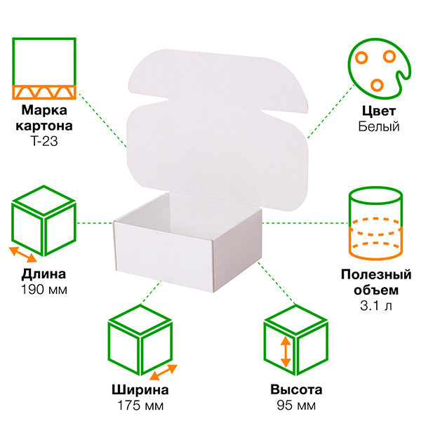 Короб КС-427 МГФ, серии КС-400, белый, длиной 190 мм, шириной 175 мм и высотой 95 мм. Изготовлен из микрогофрокартона Т-23. Полезный объём — 3.1 л.