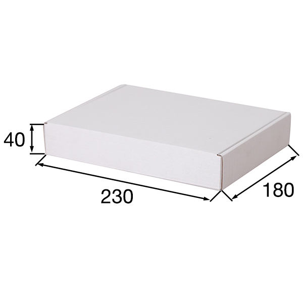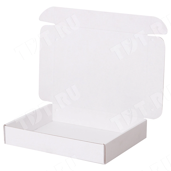 Короб КС-429 МГФ, серии КС-400, белый, длиной 230 мм, шириной 180 мм и высотой 40 мм. Изготовлен из микрогофрокартона Т-23. Полезный объём — 1.6 л.