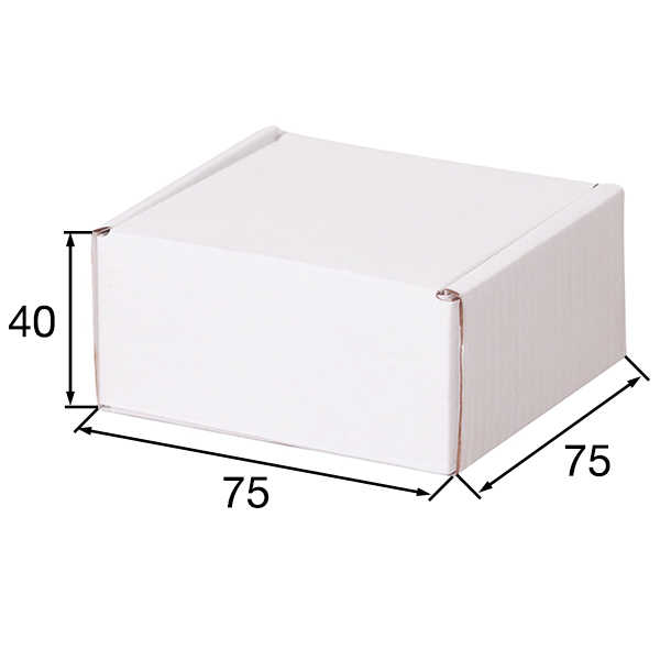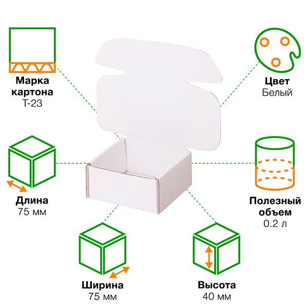 Короб КС-433 МГФ, серии КС-400, белый, длиной 75 мм, шириной 75 мм и высотой 40 мм. Изготовлен из микрогофрокартона Т-23. Полезный объём — 0.2 л.
