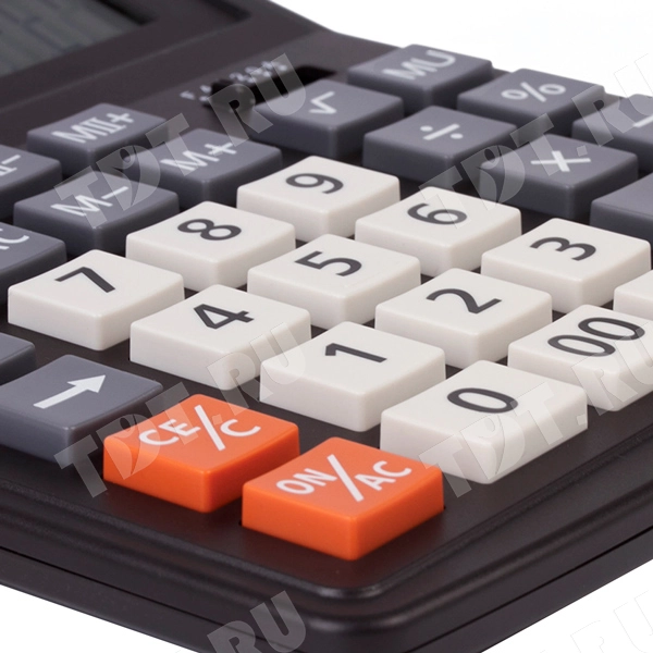 Настольный калькулятор STAFF Plus STF-333, черно-серого цвета, длиной 200 мм, шириной 154 мм, весом 276 г. Имеет две независимые памяти, возможность установки режимов округления и ограничения количества знаков после запятой, клавишу корректировки последнего знака, клавишу "Два нуля" и клавишу расчета наценки. Производится в Китае.