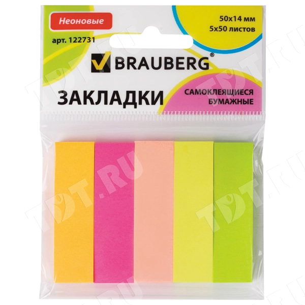 Бумажные клейкие закладки BRAUBERG, прямоугольные, длиной этикетки 50 мм, шириной этикетки 14 мм, в наборе 5 цветов по 50 этикеток (общее количество закладок 250 штук), код производителя 122731. Упаковка — полибег с европодвесом. Производятся в Китае.