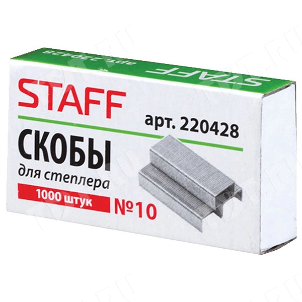 Скобы STAFF для степлера №10, в упаковке по 1000 штук, сшивают до 20 листов бумаги, серебристого цвета, код производителя 220428, размером 10 мм. Материал – сталь с цинковым покрытием. Производится в Китае.