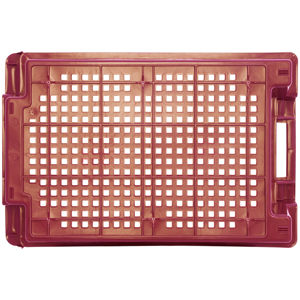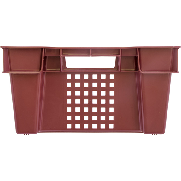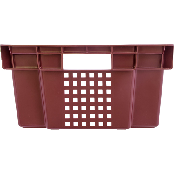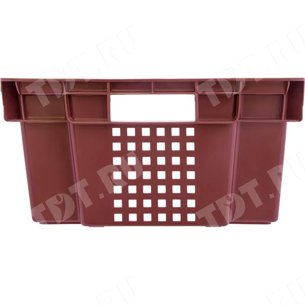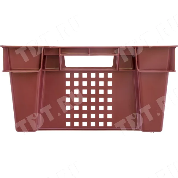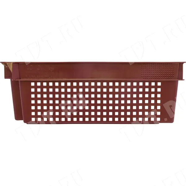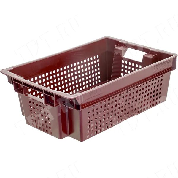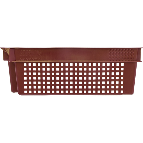 Конусный перфорированный пластиковый ящик красного цвета для хранения и транспортировки овощей, фруктов длиной 600 мм, шириной 400 мм, высотой 200 мм. Изготовлен из полиэтилена. Производится в России.