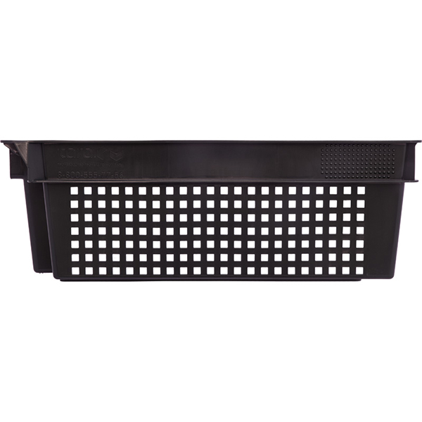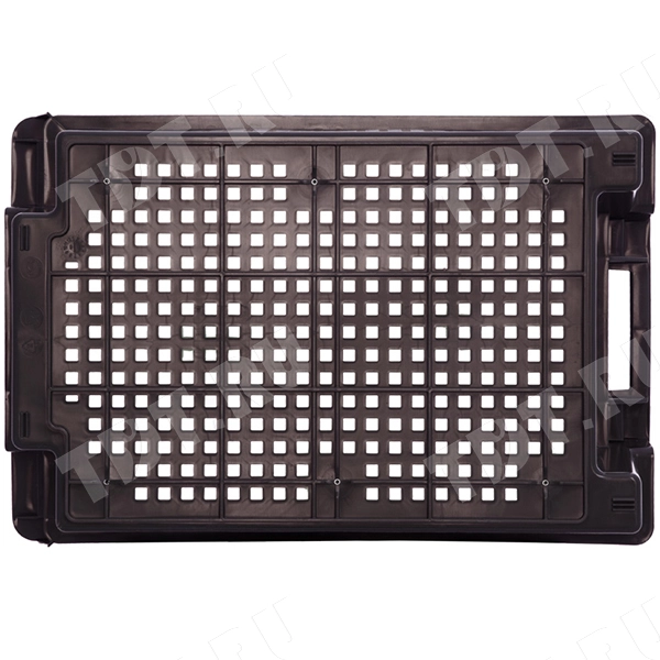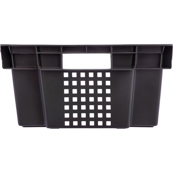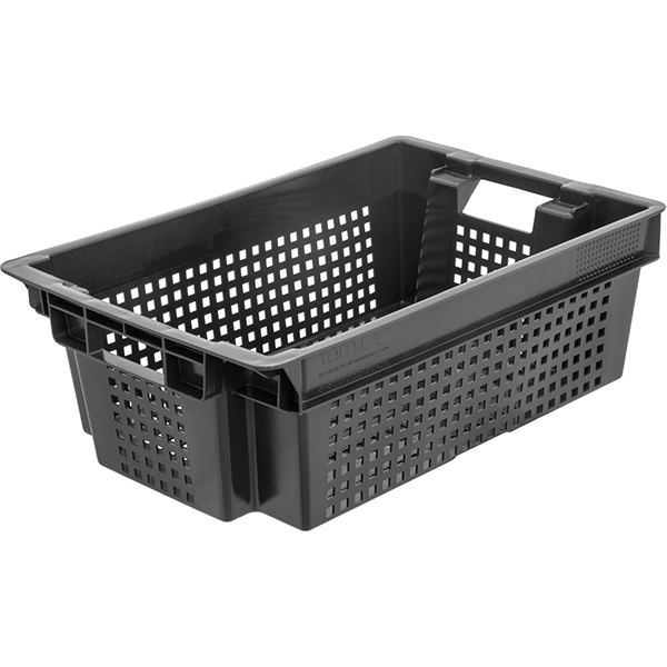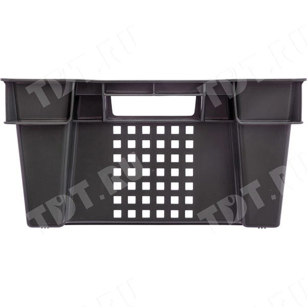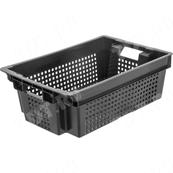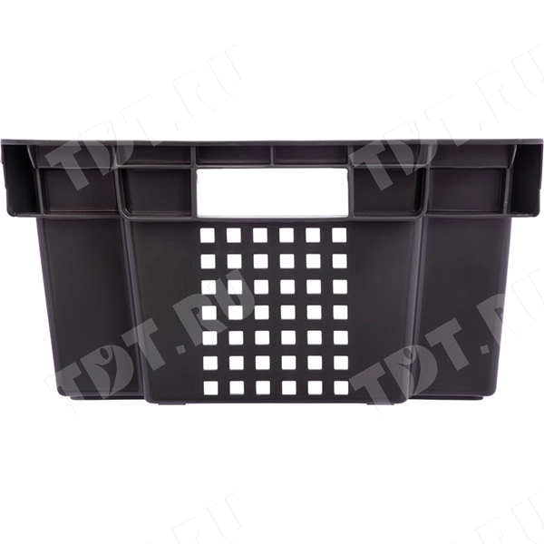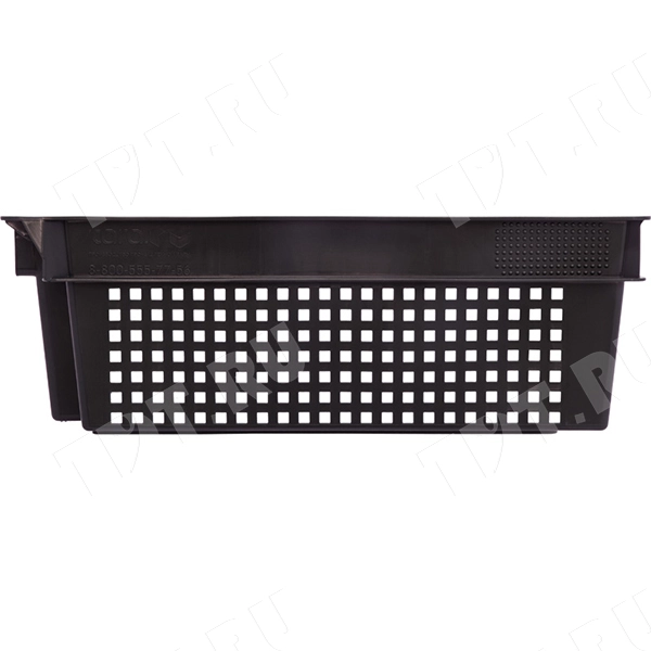 Конусный перфорированный пластиковый ящик черного цвета для хранения и транспортировки овощей, фруктов длиной 600 мм, шириной 400 мм, высотой 200 мм. Изготовлен из полиэтилена. Производится в России.