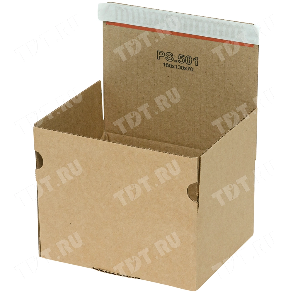 Почтовый короб PS.501 с клеевым клапаном, бурого цвета, длиной 160 мм, шириной 130 мм и высотой 70 мм. Изготовлен из трёхслойного гофрокартона Т-23 В. Полезный объём — 1.46 л.