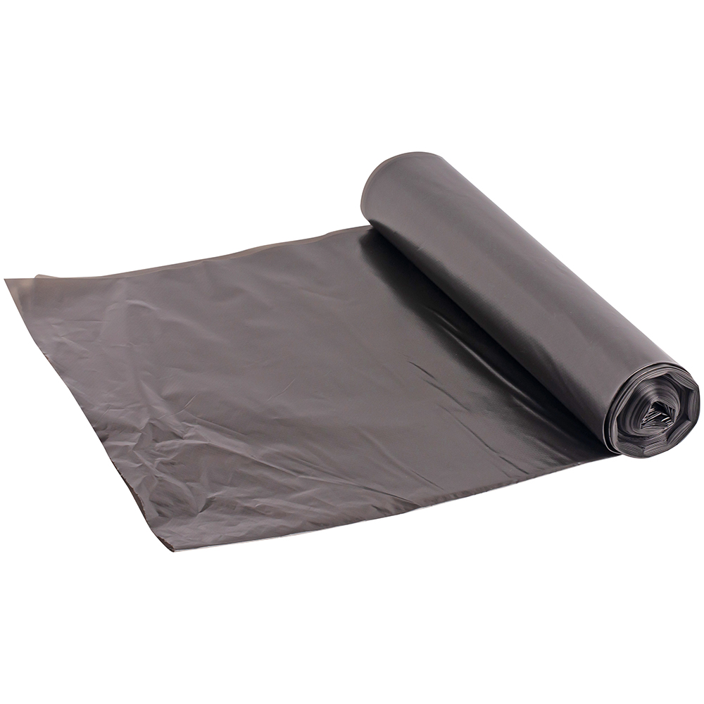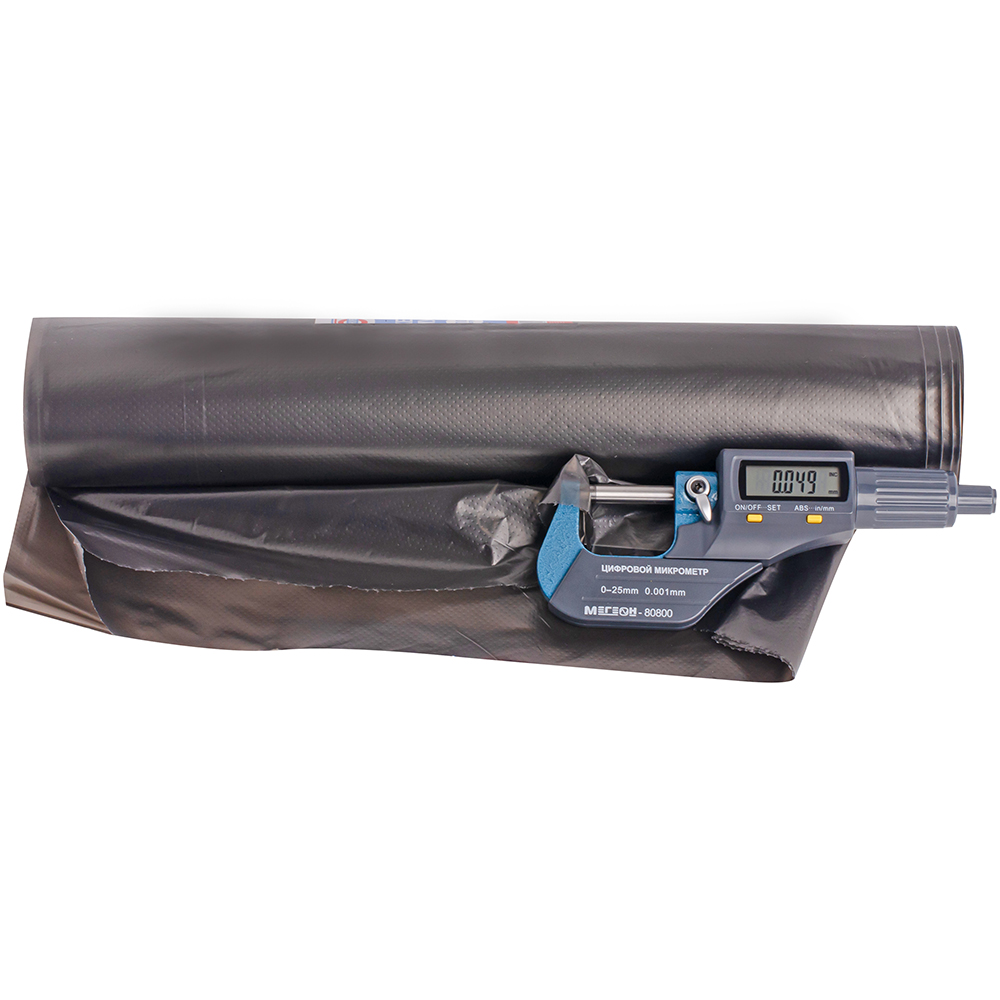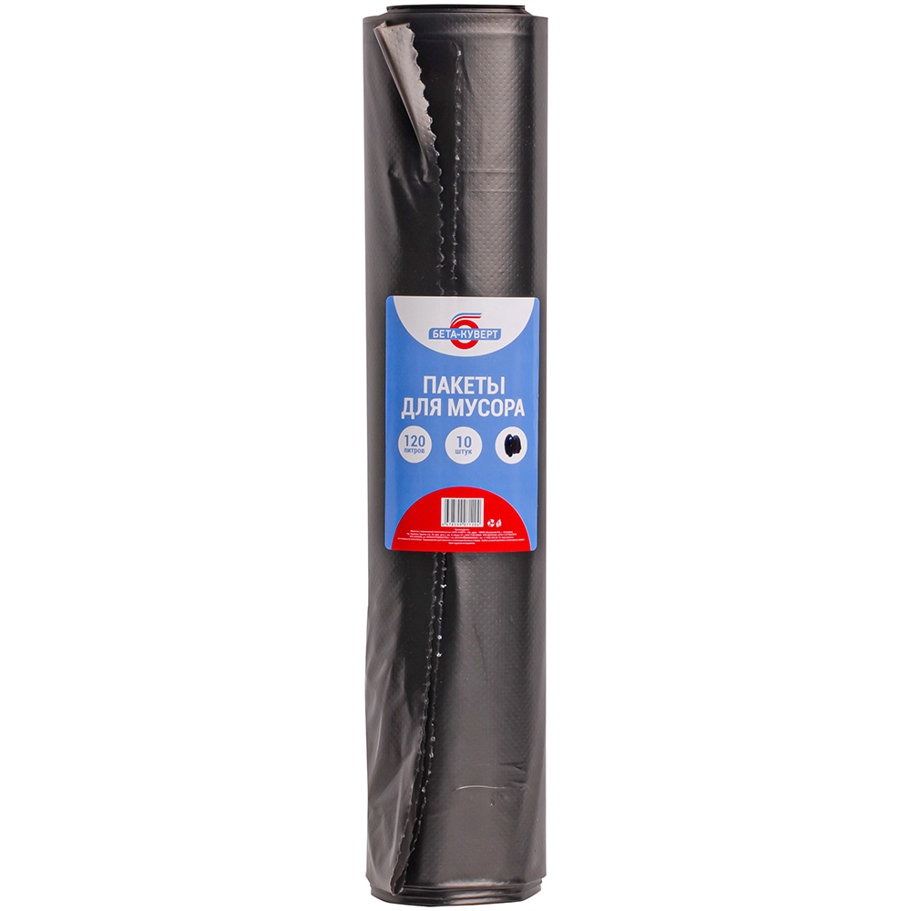 Пакеты для мусора Бета-Куверт повышенной прочности, черного цвета, объемом 120 л, длиной 120 см, шириной 60 см, толщиной 49 мкм, в упаковке по 10 штук. Изготовлены из полиэтилена среднего давления (ПСД). Производятся в России.