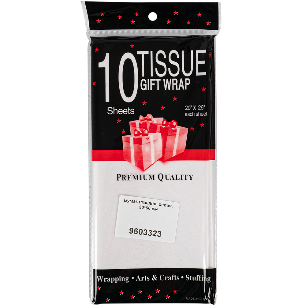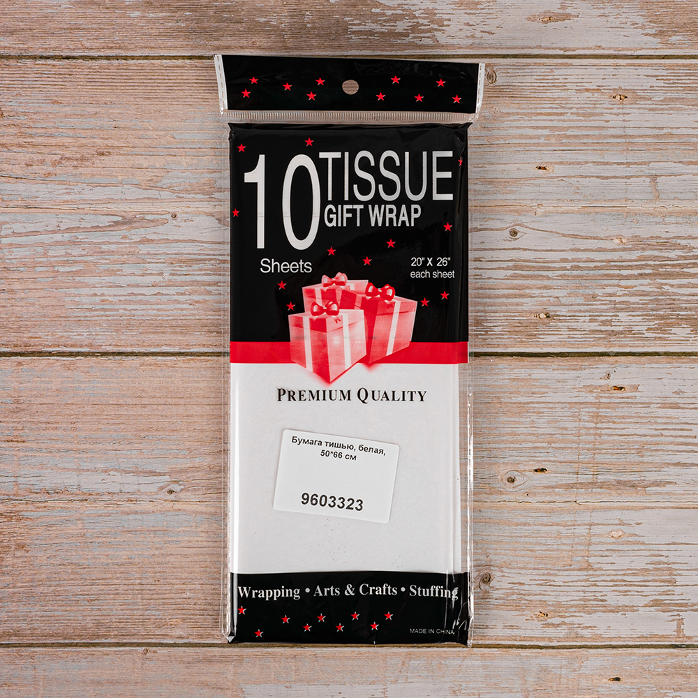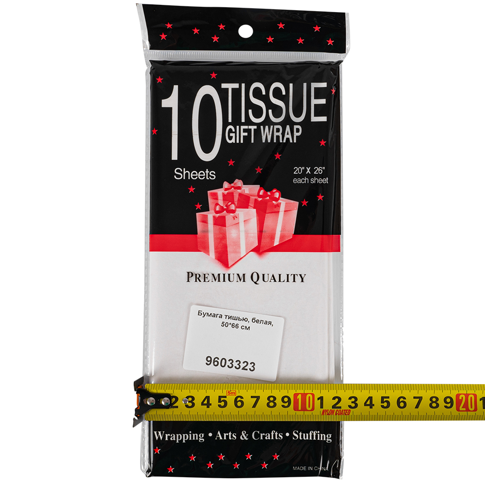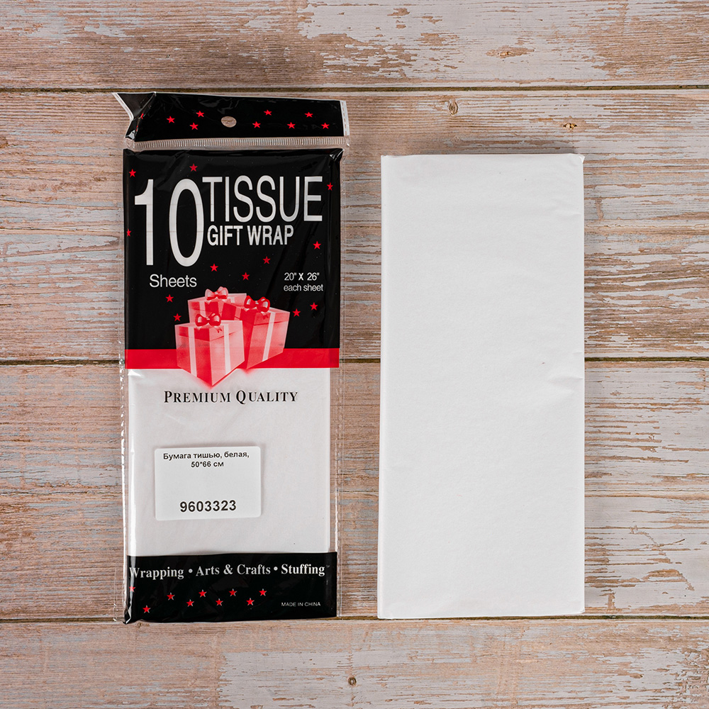 Белая бумага тишью шириной 50 см, длиной 66 см, плотностью 20 г/м² по 10 листов в упаковке. Шероховатая упаковочная бумага для оформления и украшения подарков.