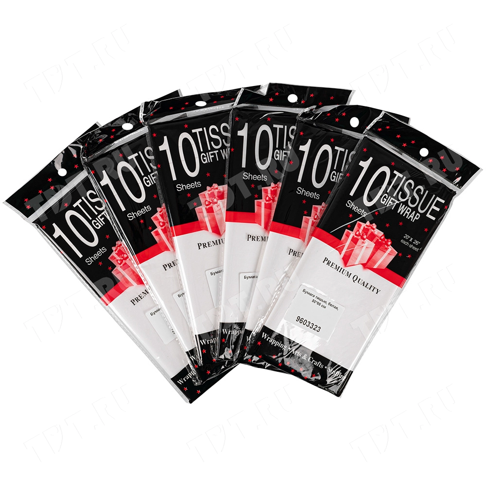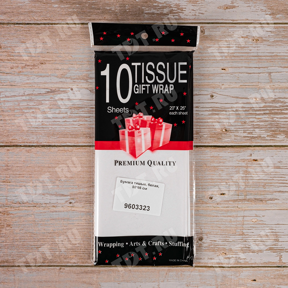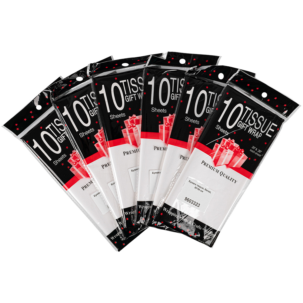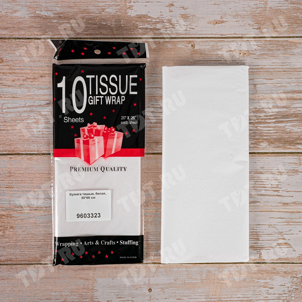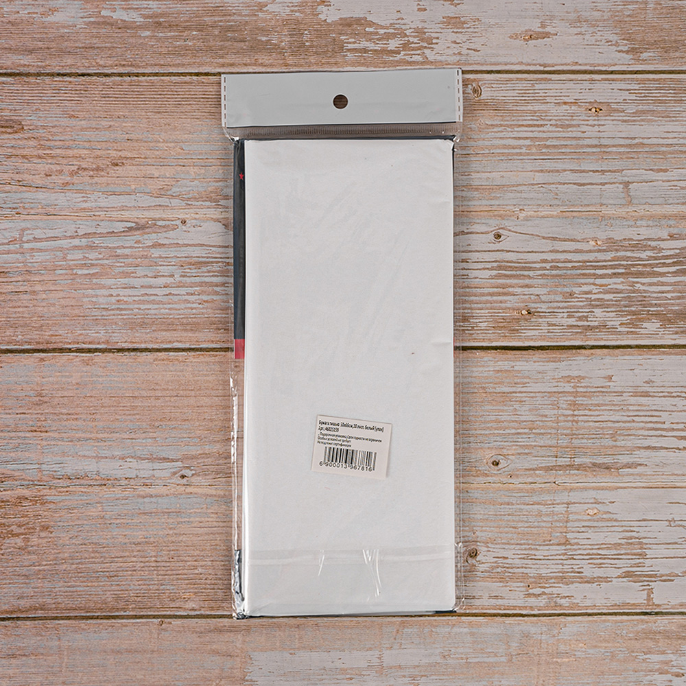 Белая бумага тишью шириной 50 см, длиной 66 см, плотностью 20 г/м² по 10 листов в упаковке. Шероховатая упаковочная бумага для оформления и украшения подарков.