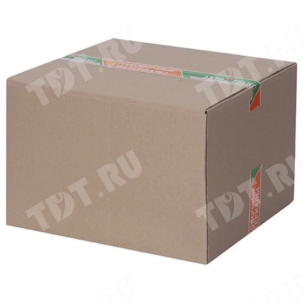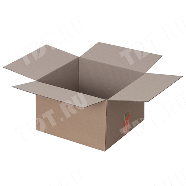 Картонный короб СДЭК тип «S» бурого цвета, длиной 200 мм, шириной 190 мм и высотой 130 мм. Изготовлен из трехслойного картона марки Т-23 В. Полезный объём — 4.94 л.